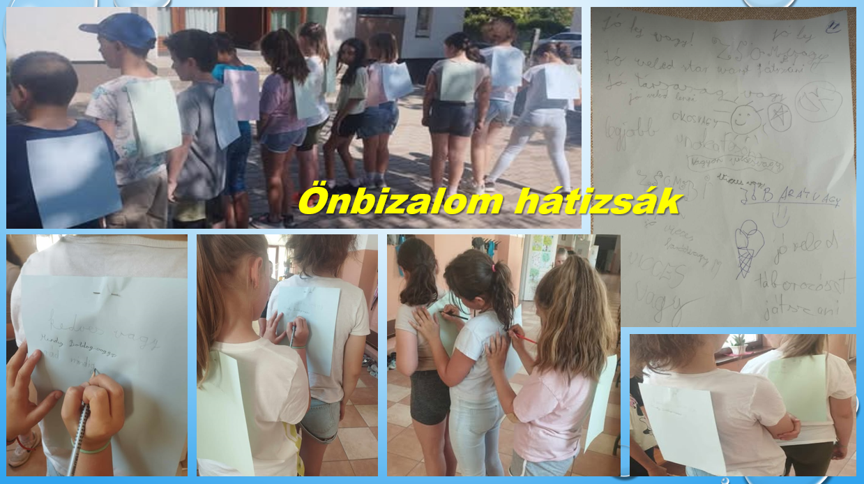Nagyon jó önbizalomépítő játéknak bizonyult az „Önbizalom hátizsák”, aminek kapcsán minden tanuló kapott egy A/4-es lapot, amit feltűztem a pólója hátuljára. Ezután mentek a dolgukra, sétálgattak az udvaron, a folyosón, és egymás hátára írogattak pozitív dolgokat, jó tulajdonságokat, megerősítéseket, amiket aztán szívesen olvasgattak a séta végén. Alig várták, hogy megnézhessék az üzeneteket, nagyon élvezték a játékot.