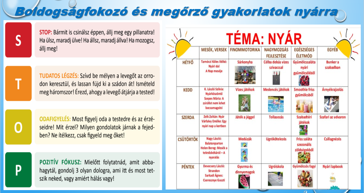 ……..… és, hogy a nyári szünetben se maradjon senki jó tanácsok nélkül, ha szüksége lenne rá, a segédletekben található „Nyári boldogságfokozó gyakorlatok” című táblázatot felhelyeztem a szekrényünk ajtajára, hogy a tanév maradék napjaiban mindenki kedvére „mazsolázhasson”, jegyzetelgessen belőle. Találtam még további képes útmutatót is erre vonatkozólag, ami heti és napi bontásban tartalmazott ötleteket a szabadidő hasznos és tartalmas eltöltésére vonatkozóan. Ezzel az útravalóval zártuk le a boldogságórákat ebben a tanévben. Remélem, minden gyermek maradandó emlékekkel, szép élményekkel gazdagodva kezdheti meg június 21-től megérdemelt nyári pihenését!