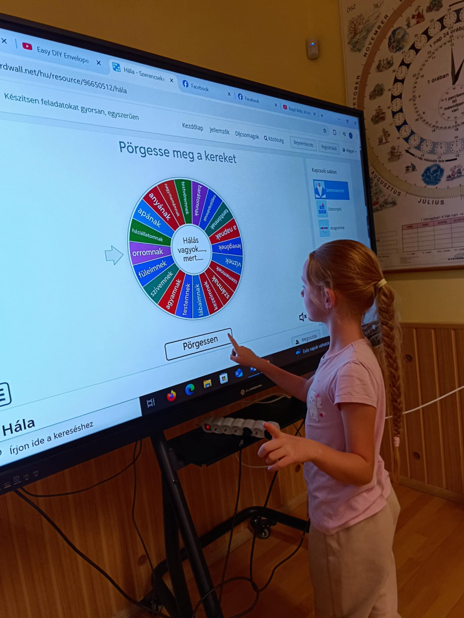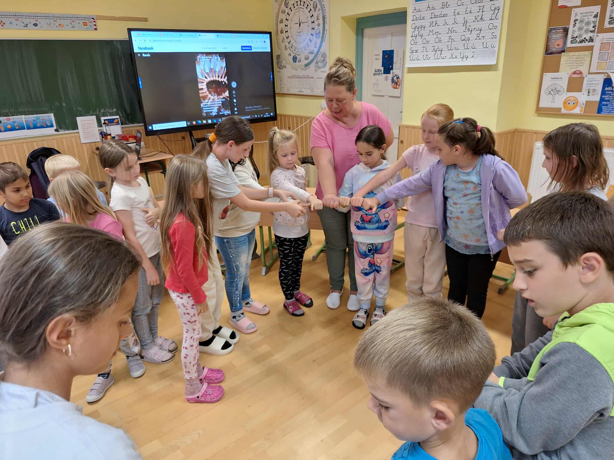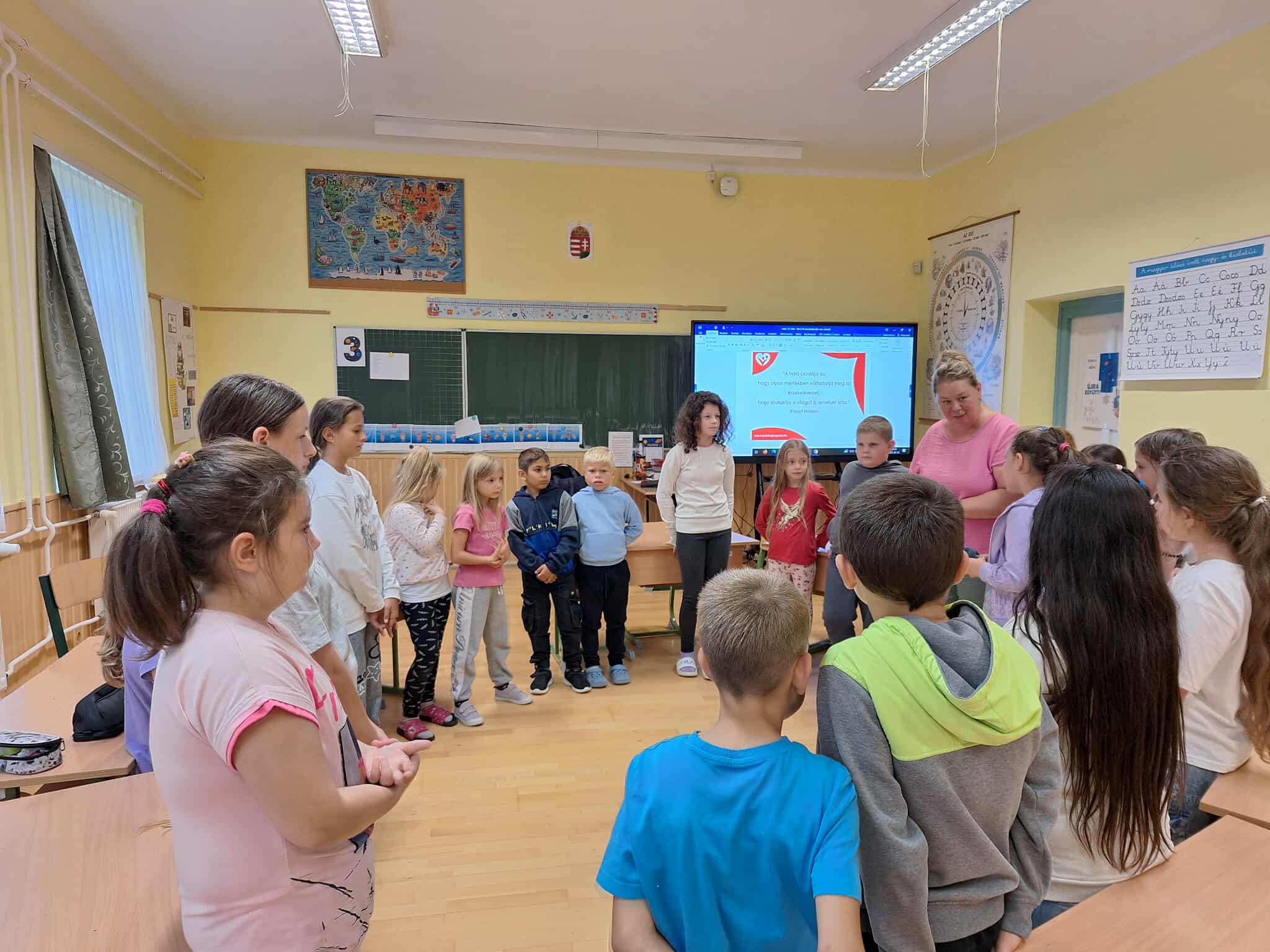 Ritmusgyakorlattal folytattuk. Lapokat rejtettem el, melyeken egy-egy gondolatot láthattunk. Örömmel keresték a gyerekek, majd felolvasták, megbeszéltük a hála lényegét. Meghallgattuk a Jól érzem magam című dal, melyre mozogtunk kedvünkre. Körben állva megfogtuk egymás hüvelykujját, az összetartozásunkat erősítve. Kiraktuk a hála feliratot a tanteremben található dolgokból. Az interaktív táblán szerencsekerék forgatásával és a boldogságóra értékelésével zártuk a foglalkozást. Mindenki gazdagodhatott, feltöltődhetett. Külön hálás vagyok, mert a felsősök segítették, kísérték a kisebbeket. Az együttműködés teljes mértékben megvalósult. A cél megvalósult, a témánkat körbejártuk amennyire csak lehetett. Bízom benne, hogy a résztvevő tanulók viszik tovább a jó hangulat hírét, a hála fontosságát. Azon leszünk, hogy minél több gyerekre, felnőttre pozitív hatást gyakoroljuk magunk által. Jobb általunk a világ! Jobb velünk, veletek a világ!