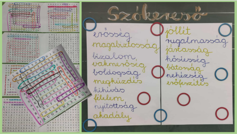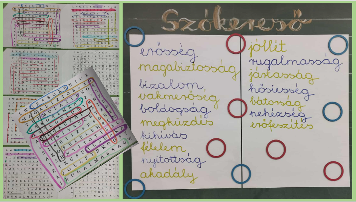 Február a megküzdési stratégiák hónapja. A fogalom tisztázására és megértésére egy jó ábrát találtam az interneten. Egy ép, kihegyezett ceruza ábrázolta, hogy az életben minden jól megy. A kettétört ceruza azt mutatta meg, hogy életünkben történhetnek váratlan események, amikre nem mindegy, hogyan reagálunk. Elkeseredünk, szomorúak leszünk miatta, mert eltörött, vagy örülünk, hiszen a széttört ceruzát mindkét felén kihegyezhetjük, így tovább használhatjuk. A tanítás pedig: „ALAKÍTSD ÁT A PROBLÉMÁKAT LEHETŐSÉGEKKÉ!” Ehhez magabiztosság, eltökéltség, határozottság szükséges, így megtanultuk a „Stabil vagyok, mint egy hegy” című gyakorlatot, hogy minden váratlan helyzetet képesek legyünk megoldani. A melléklet SZÓKERESŐ játékában együtt kerestük meg azokat a fogalmakat (erősség, magabiztosság, vakmerőség, bizalom, bátorság, hősiesség, erőfeszítés, kihívás, nyitottság… stb.), amik a feladatok biztonságos végrehajtásához szükségesek. Ezeket, hogy érthetőbbek és átláthatóbbak legyenek, felírtam két A/3-as lapra színes filccel, majd felhelyeztem őket a táblára. Utána megbeszéltük, hogy miben lehetnek a segítségünkre küzdelmeink során.