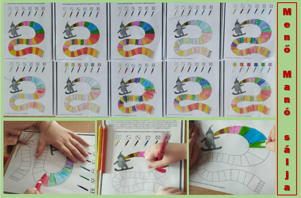 Menő Manó sálját, a „magabiztosság sálját is kiszíneztük, hogy emlékeztessen minket arra, hogy semmi sem lehetetlen, csak bátorság, kitartás és magabiztosság kell hozzá! Ez a játék is élvezetes volt, mert a dobókockával kidobott színekkel színeztük ki a sál minden csíkját, így minden gyerek többször is sorra került a dobásban.
