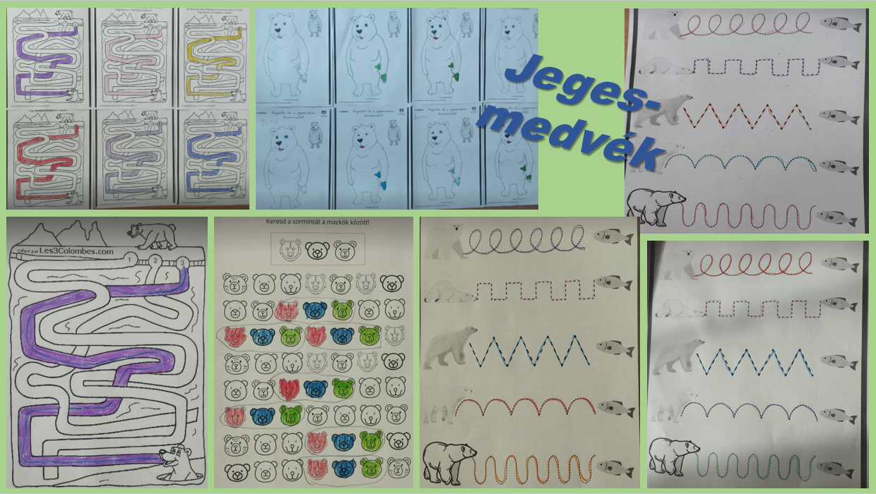 A jegesmedvék világnapja (február 27.) alkalmából elvégeztük a velük kapcsolatos vonalvezetési feladatokat: átrajzoltuk a jegesmedvét, elvezettük őt az élelemhez, átkeltünk a labirintuson, hiszen a jegesmedve a túlélés, az erő, a bátorság szimbóluma, az északi népek totemállataként pedig a magányos, de bölcs útkeresőt jelképezi. Amellett, hogy rajzolás közben jól szórakoztunk, a gyerekek írásmozgás-koordinációja is észrevétlenül fejlődött.