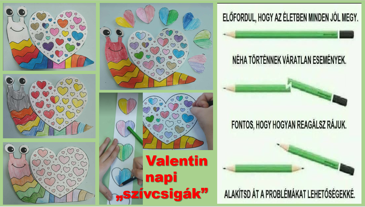 A február 14-i Valentin nap kapcsán a szeretetről, összetartozásról is beszélgettünk. Szívecskéket díszítettünk, nyírtunk. Kis csigákat is színeztünk, amiknek a háza egy nagy szívecske volt. A gyerekek örömmel tervezték, hogy kinek fogják elajándékozni őket.