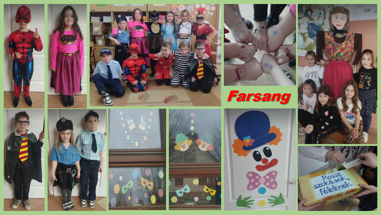 Megküzdeni a kitűzött céljaink megvalósításáért nem mindig egyszerű feladat. Gyakran könnyebb, ha mások bőrébe, szerepébe bújunk ilyenkor, hiszen az álarcban kicsit el lehet bújni. Erre kiváló alkalom volt a farsangi délutánunkon megrendezésre kerülő jelmezes felvonulás. Szuperhősök, táncosok, rendőrök, cica, tündér, Elza hercegnő, bankrabló, szakács, focista – minden maskara segítette a gyerekeket a szerepek megélésében, így egy kis időre azzá válhattak, amibe beöltöztek. A hatást fokozta a farsangi dekoráció is: lampionok, bohócok, füzérek, ablakdíszek + még csillámtetkót is kaptak a gyerekek a csuklójukra. Idén is készítettünk életnagyságú kiszebábot, mellé pedig a „Rossz szokások és félelmek” ládikája is odakerült. Ez egy lezárt cipősdoboz, amibe kis cetliket helyezünk, ezeken szerepelnek azok a tulajdonságok, negatív dolgok, amiktől meg szeretnénk szabadulni, amik ellen folyamatosan küzdünk. Ez jelképesen meg is történt, hiszen a ládikát a kiszebábbal együtt február 17-én, húshagyó kedden elégettük.