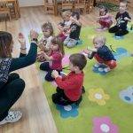 A foglalkozást az „Almát szedj, ügyesedj!” ráhangoló gyakorlattal kezdtem. Mondtam a gyerekeknek, hogy most egy kertben járunk, ahol még maradt néhány alma a fákon és pár szőlő a tőkéken. Szedjük le a maradékot. Ezt a gyakorlatot háromszor megismételtük. Utána elmondtuk a már jól ismert ujj mondókát (Hüvelykujjam almafa…) is. Ezt követően meséltem el „Az alma és a kerti manó” című mesét, bábok és egyéb kellékek segítségével (száraz fű, ecset, fagally). A mese után eljátszottuk, hogy mi is kerti manók vagyunk, elkészítjük mi is a festéket, mint a mesében. A gyerekek utánzó mozgássorral végezték utánam, amit bemutattam. Szedtük a száraz fűszálakat a rétről, ebből ecsetet kötöttünk, a kettétört mákfejbe olvasztottunk napsugarat, öntöttünk hozzá friss harmatot és jól elkevertük. Végül öntöttünk a tenyerünkbe a festékből, összedörzsöltük a kezeinket és megsimogattuk vele az arcunkat. Elképzeltük, mintha mi lennénk a fán maradt alma és pirosra festjük az arcunkat. Utána megkértem a gyerekeket, hogy keressenek párt maguknak és simogassák meg egymás arcát. Csillogó szemű, mosolygós arcú kis almákat láttam.