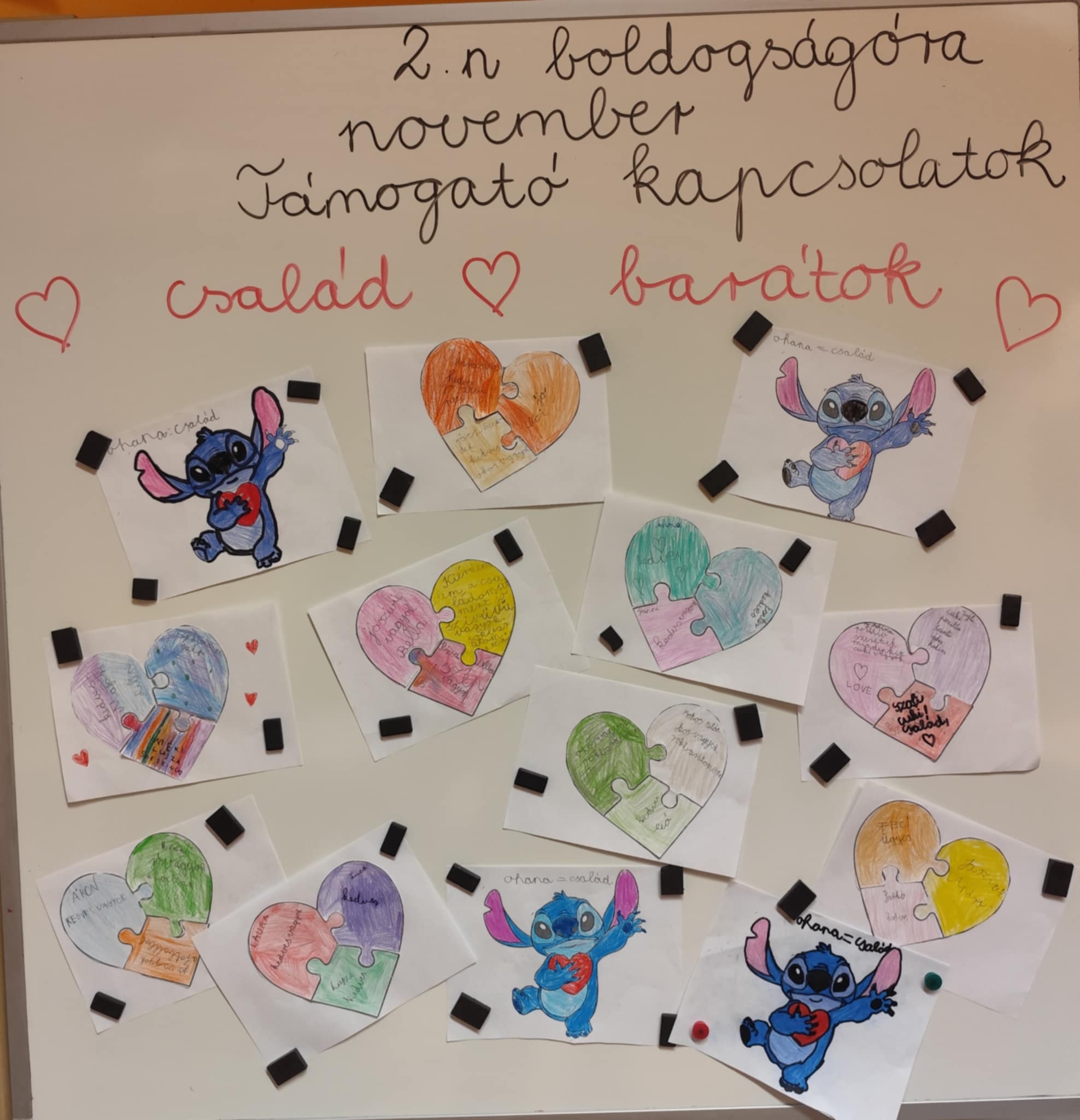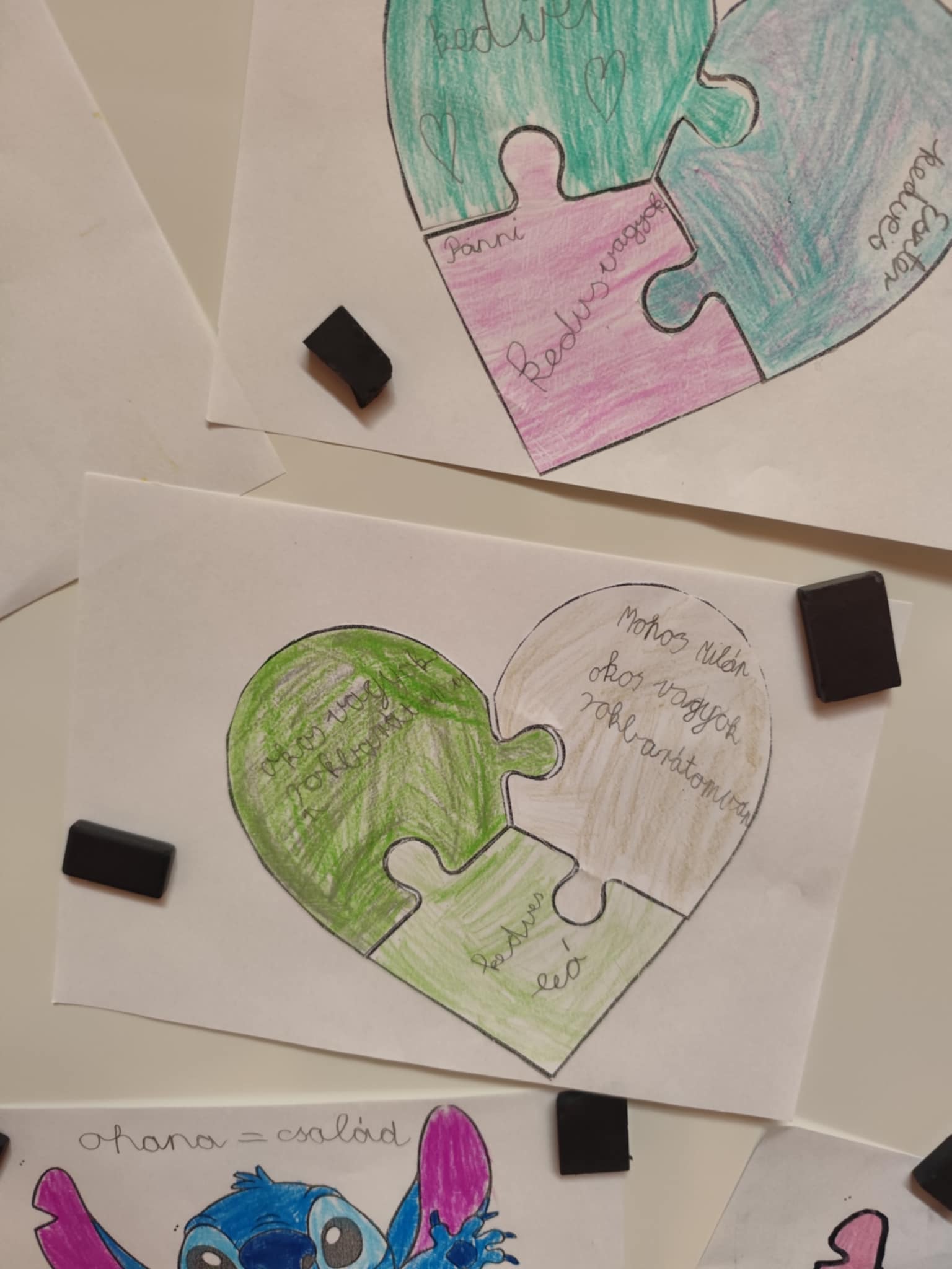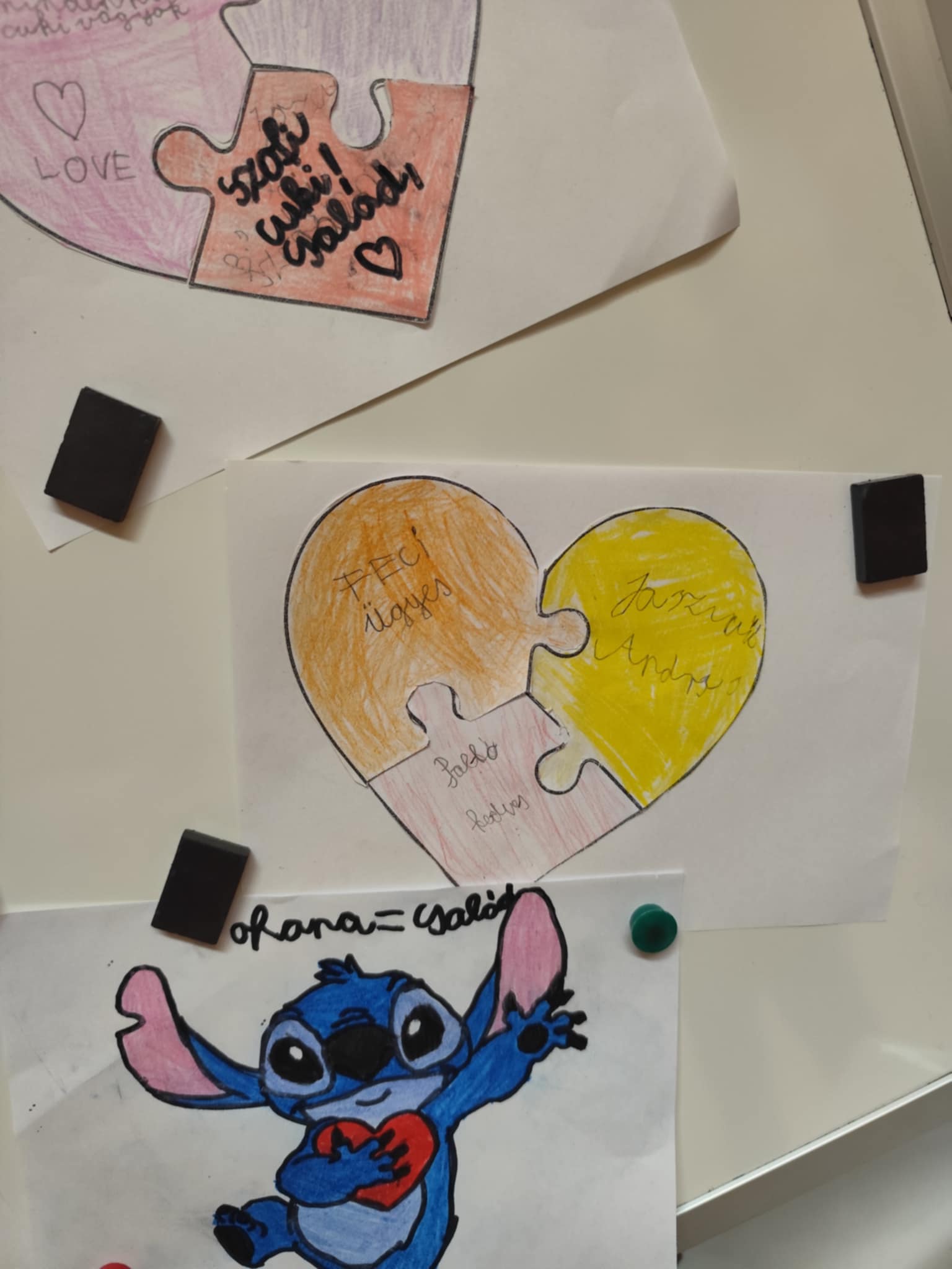 Megvizsgáltuk, mitől lesz egy kapcsolat valóban támogató. A gyerekek megosztották saját élményeiket, majd közösen fogalmaztuk meg, hogyan válhatnak ők is jó barátokká, figyelmes társakká, szeretetteljes családtagokká. Lilo és Stitch történetén keresztül rávilágítottunk a család fontosságára, arra, milyen jó érzés családra találni, szeretni és szeretve lenni.