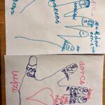 Majd a gyerekek körberajzolták a kezüket, minden ujjuk egy-egy fontos kapcsolatot szimbolizált, így ezeket megrajzolták, feliratozták.