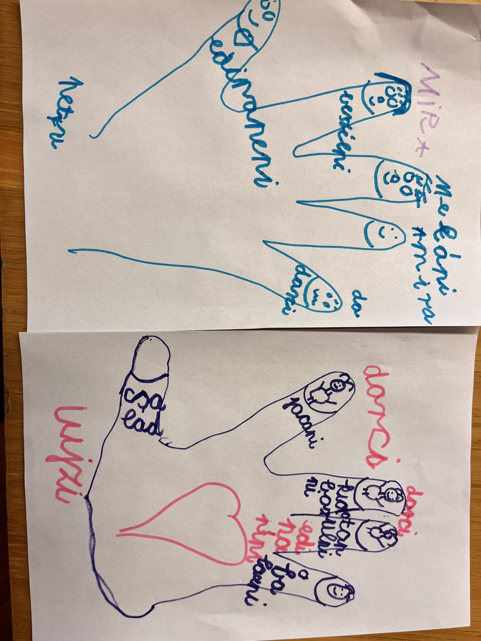Majd a gyerekek körberajzolták a kezüket, minden ujjuk egy-egy fontos kapcsolatot szimbolizált, így ezeket megrajzolták, feliratozták.