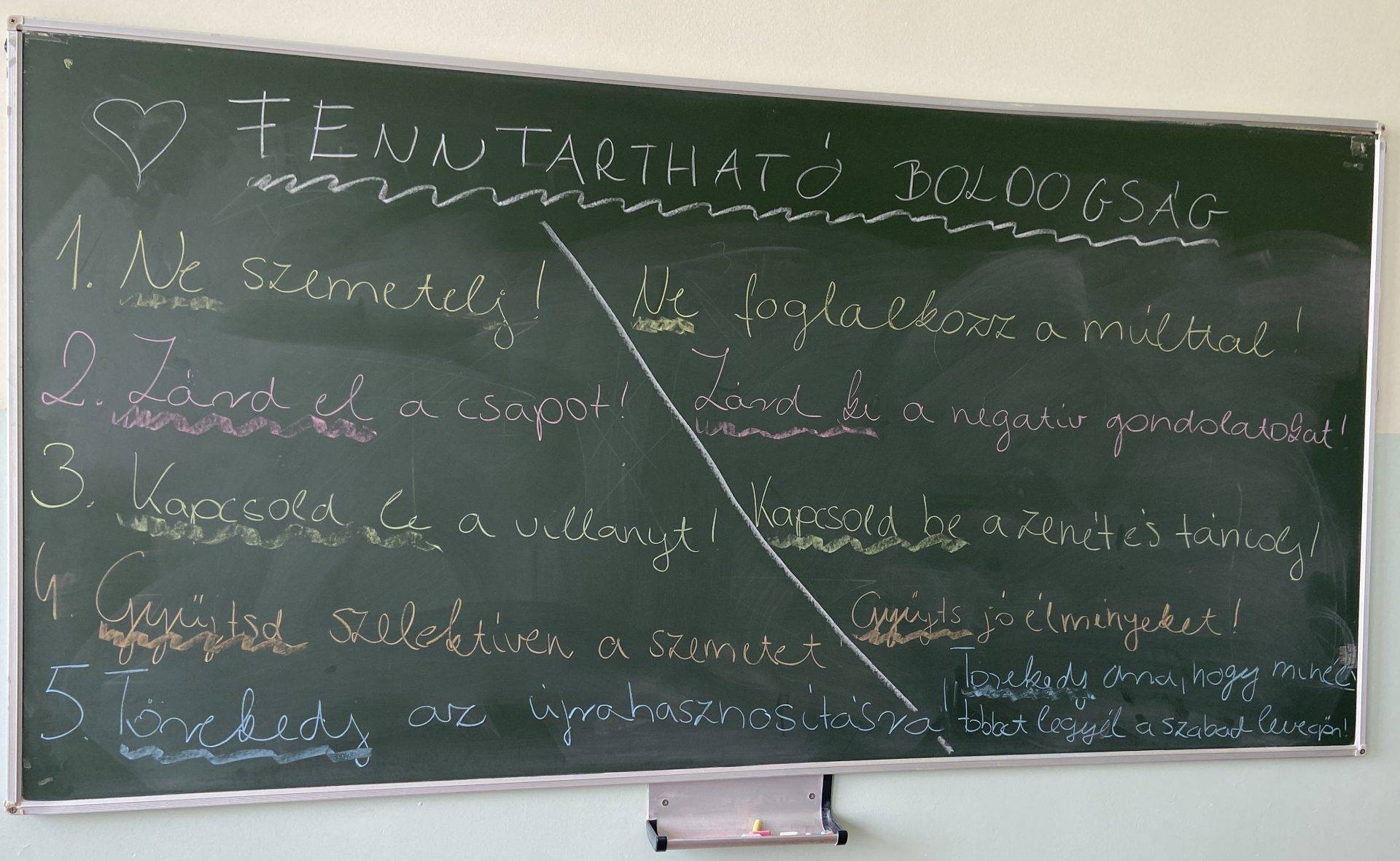 A „fenntartható boldogság” kifejezés elemzéseként, diákjaink először összegyűjtöttek egymásnak (és maguknak) 5 tanácsot azzal kapcsolatban, hogy mit tehetnének egy fenntarthatóbb jövő, és a környezetvédelem érdekében. Ezután a kapott mondatok első szavával (legtöbbször igéjével) fogalmaztak meg további 5 tanácsot, hogy mit tehetnének minden nap azért, hogy boldogabbak legyenek. A javaslatok összegyűjtésének végeztével többször is elismételték együtt hangosan az egymás mellett lévő tanácsokat, hogy ezzel is elmélyítsék törekvéseiket a fenntartható boldogság érdekében. A diákok rendkívül élvezték a folyamatot, kellemes tanévzáró foglalkozás volt ez számukra.