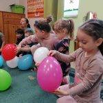 Érzékszerveinkkel kötöttük egyve ezt a feladatot. Tálakba öntöttünk lisztet, rizst, sárgaborsót, gyöngyöket, nagy fagyöngyöt, vizet, tésztát. Megvizsgáltuk, hogy mit látunk, színe, állaga milyen, mindenki megtapinthatta. Közösen lufikba töltöttük, letakarva próbáltuk párosítani. Játék után felfujtuk a lufikat és meghalgattuk milyen hangot adnak ki. Zenekart alakítottunk, hallk, hangos gyakorlásával. Szinte minden érzékszervünket hadználtuk.