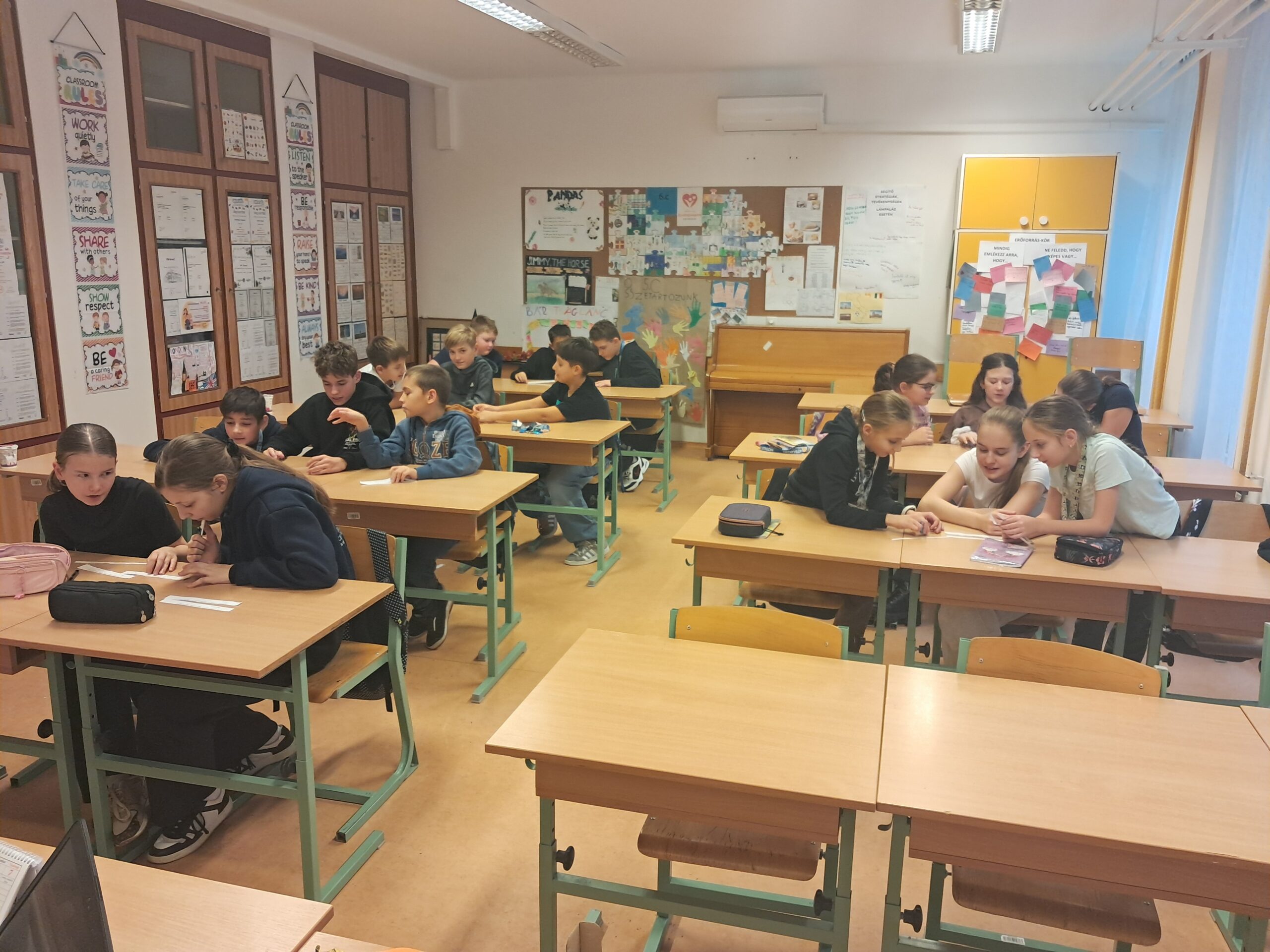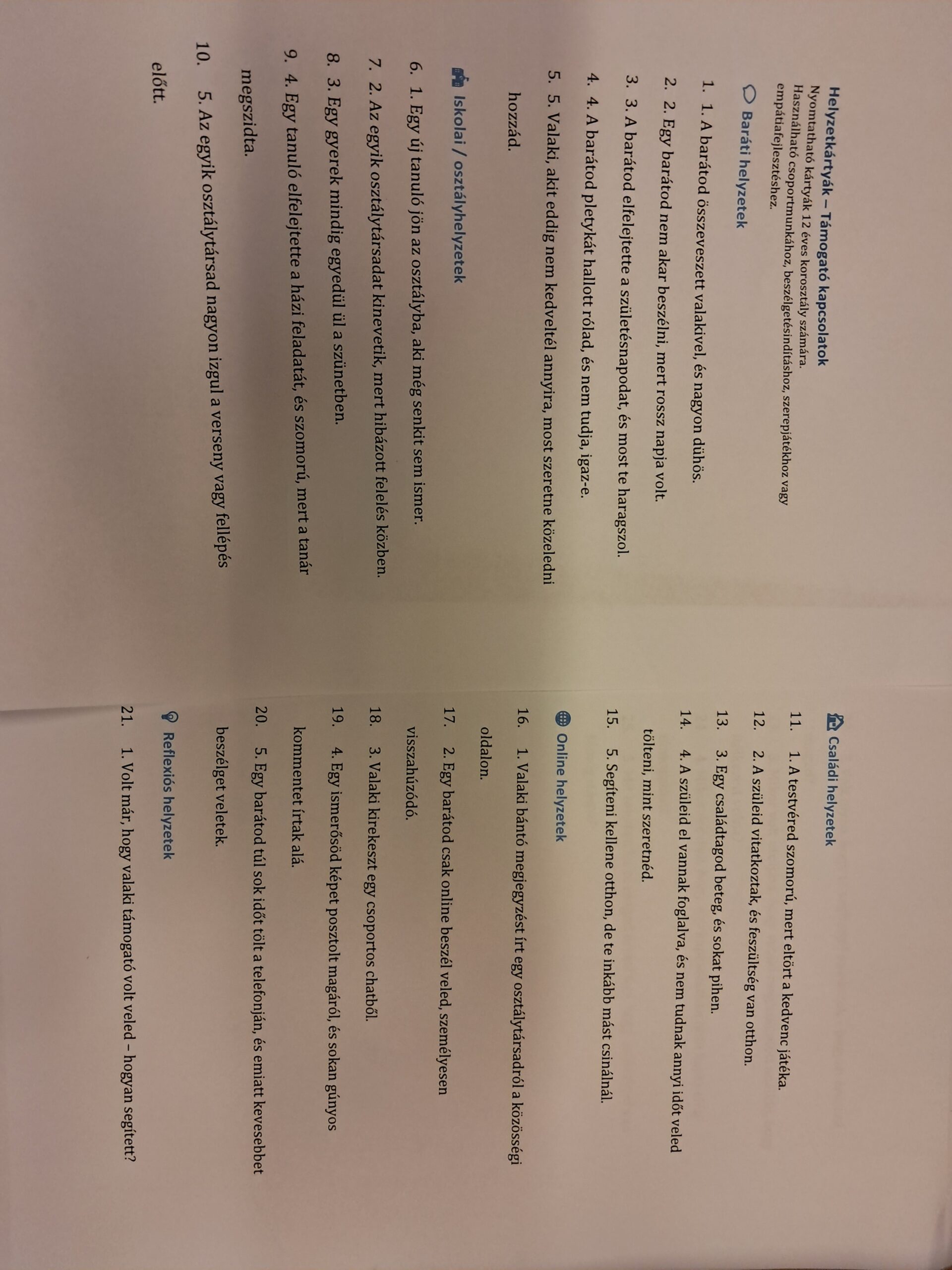 Majd csoportokban dolgoztak. Minden csoport 3-4 szituációs kártyát kapott, és arra kellett megoldást kerseniük, hogy az adott helyzetekben hogyan segítenének, mit mondanának vagy tennének. Miután megbeszélték kijöttek és eljátszották a szituációkat és megbeszéltük, hogy mit-miértgondoltak így, mi lehet a következménye, hogyan segíti ez a másikat, milyen érzéssel tölti ez el őket illetve, hogy a többiek is ugyanezt tennék vagy nem, illetve miért/miért nem.
