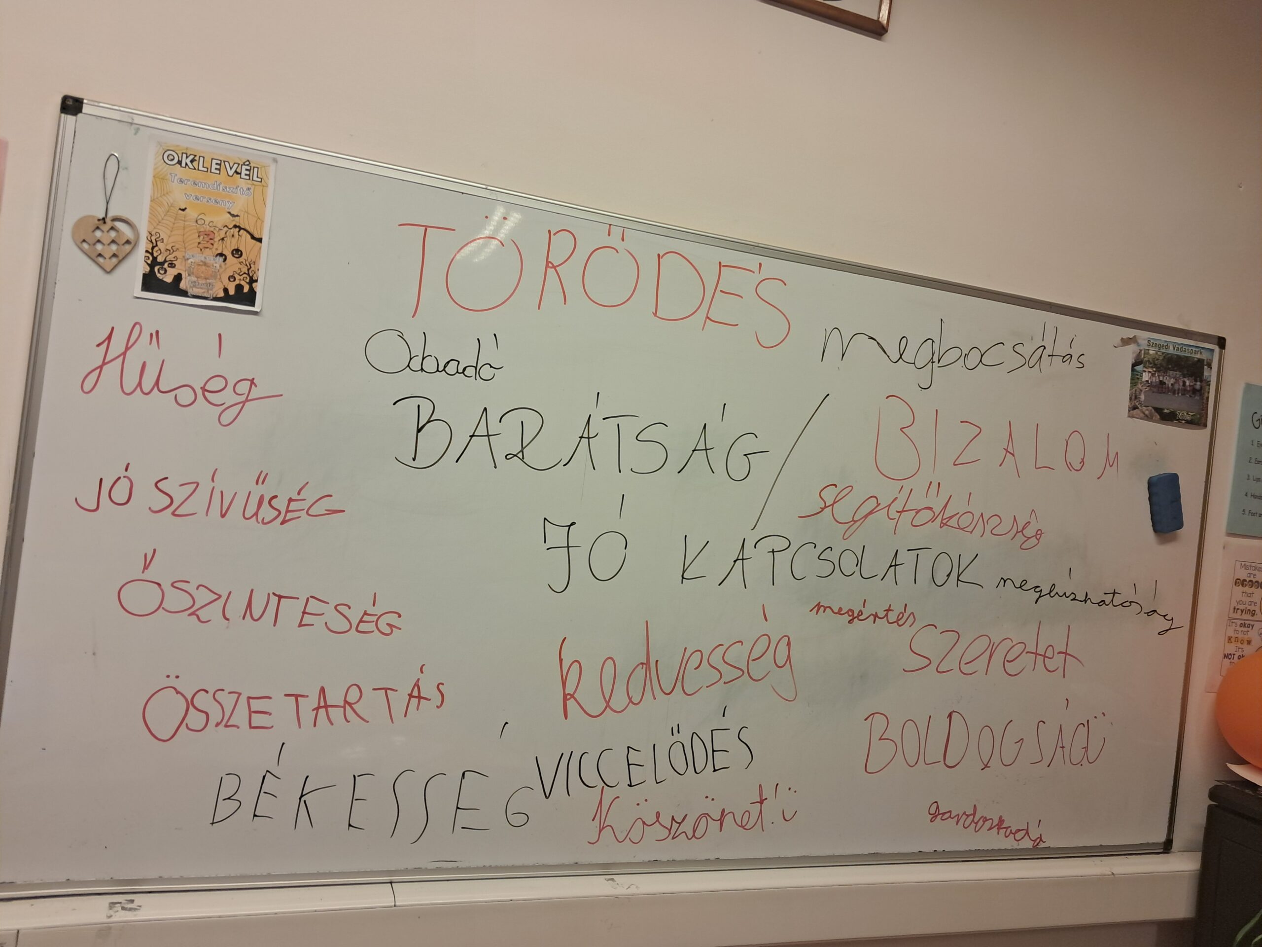 Ebben a hónapban a Boldogságórát azzal kezdtük, hogy a táblára felírták a gyerekek, hogy mi jut eszükbe a barátságról, a jó kapcsolatokról. Körüljártuk a témát, megvitattuk, hogy kikkel ápolnak szoros kapcsolatot (osztálytásak, edzőtársak, baráok, családtagok), illetve, hogy ebben az életkorban életükben a család vagy a barátok töltik be a fontosabb szerepet és miért.