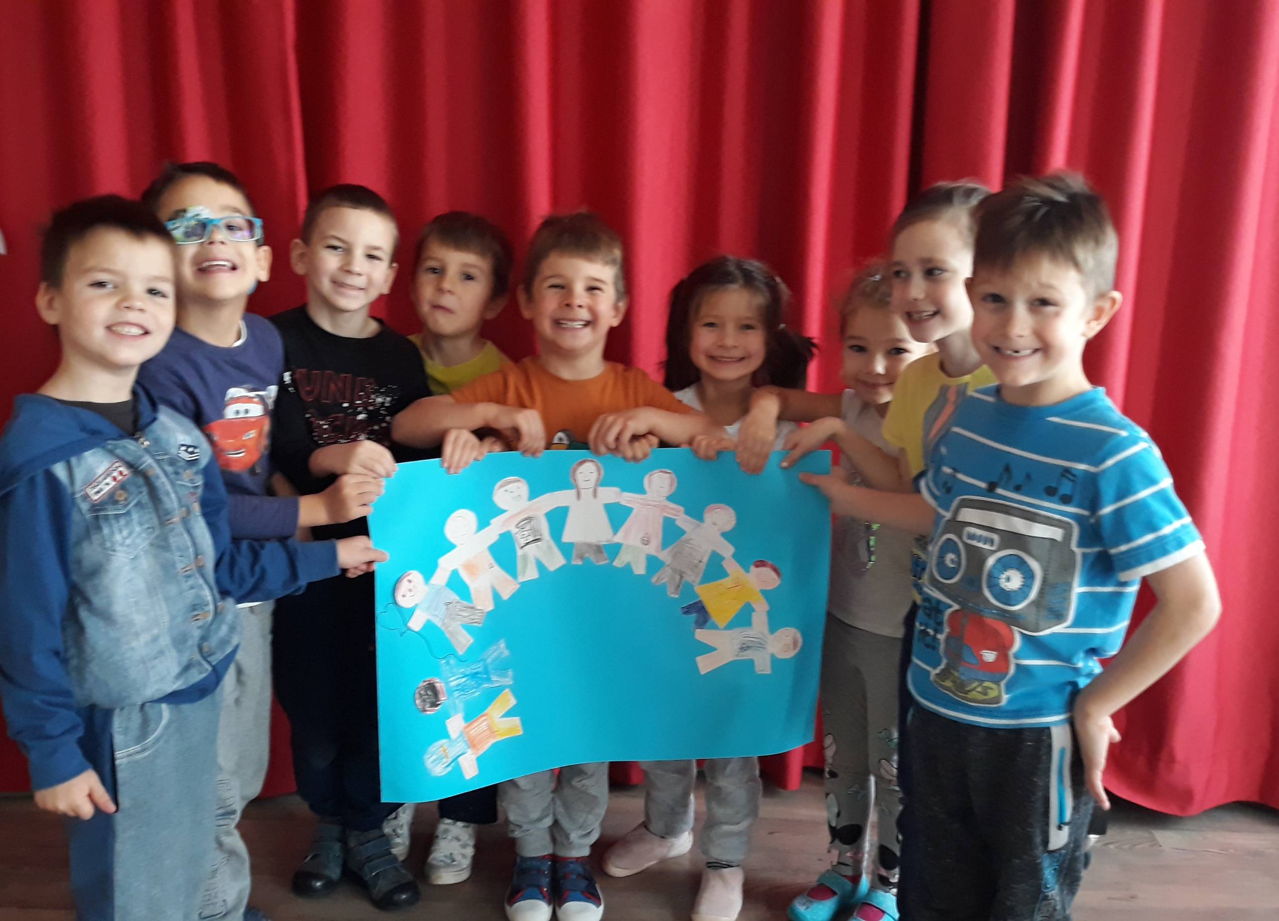 Megbeszéltük, hogy miért is van szükség társakra, miért, ha barátaink vannak. Relaxációs gyakorlatokkal folytattuk, majd Bagdi Bella cd-én lévő zenére táncoltunk. A gyermekek ezt nagyon szeretik is felszabadulnak tőle. Elbáboztam a Süni irigy lesz c. mesét, amit nagy odafigyeléssel hallgattak a gyermekek. Majd játékos feladatokkal próbáltam szemléltetni a témakört. Készítettünk zsenilia drótból egyforma színű barátságkarkötőket. Társas tornát csináltunk, amit a pároknak teljesítenie kellett. Megrajzoltuk közösen a barátság láncot, ahol mindenki saját magát rajzolta meg, majd felragasztottuk egy kartonra őket.