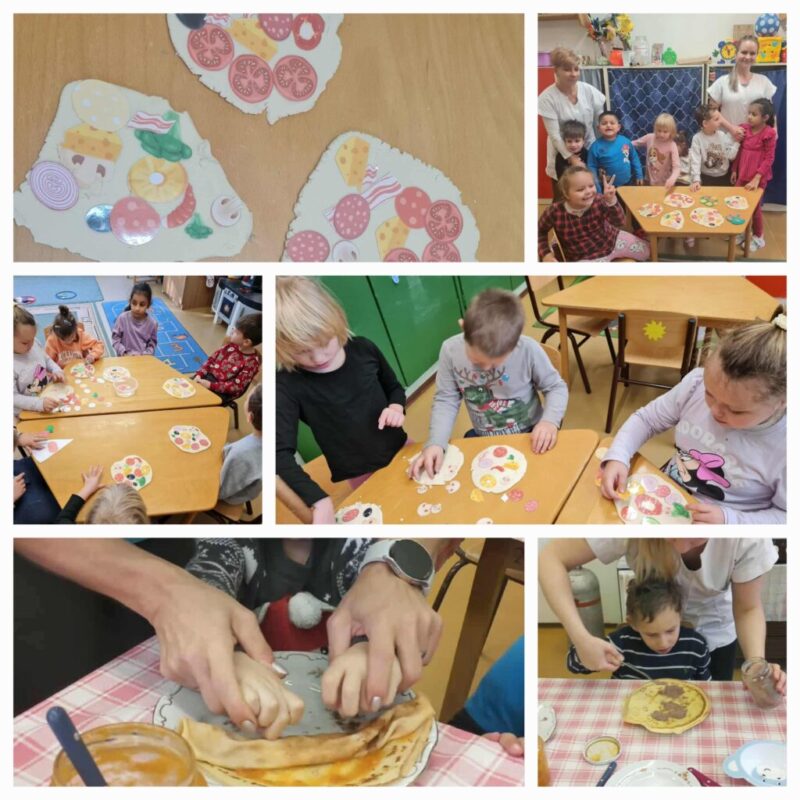 A gyerekek so-liszt gyurmából pizza lapot nyújtanak, majd pizza feltéttel díszitenek, amit egymásnak ajándékoznak.