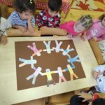 A barátságlánc elkészítéséhez 10 cm-es papír emberfigurákat készítettünk, segítségünkkel kiszínezték, majd felragasztottuk egy kartonra.