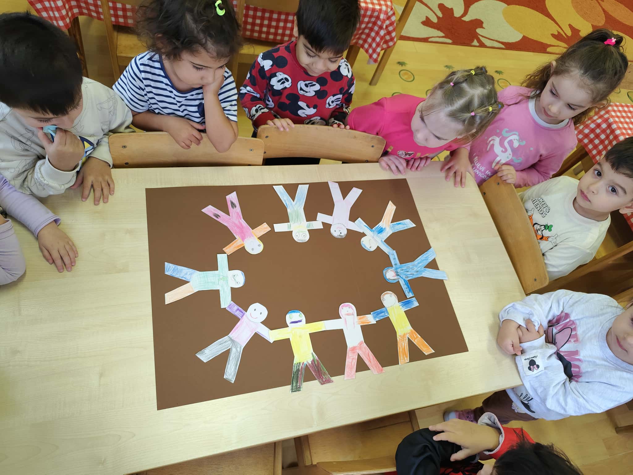 A barátságlánc elkészítéséhez 10 cm-es papír emberfigurákat készítettünk, segítségünkkel kiszínezték, majd felragasztottuk egy kartonra.