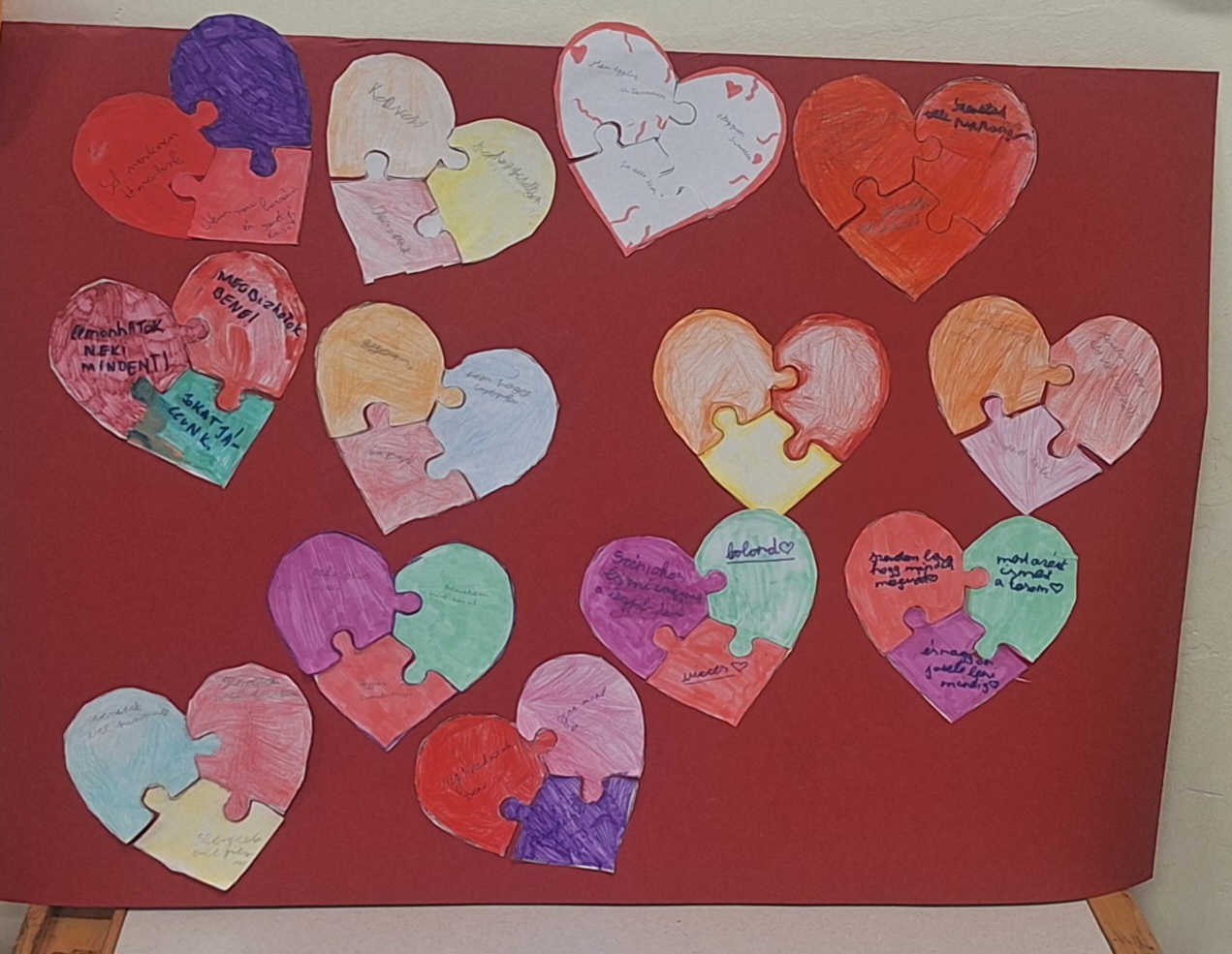 Az osztállyal a társas kapcsolatok jellemzőiről, fontosságáról és a barátokról, barátságokról beszélgettünk. Az órát egy játékkal kezdtük. Padsoronként a hónap témájának szavait kellett „postás” játékkal betűnként egymás hátára írva egymásnak átadni, majd a a sor végén lévő tanulónak kellett leírni a szót. Ezután a társas kapcsolatokról beszélgettünk, valamint hogy milyen egy jó barát, majd mindenki az általa kiválasztott barátjáról írt a szív kirakóba három olyan dolgot, amit kedvel benne. A szíveket közösen ragasztották össze egy nagy piros kartonra az óra végén.