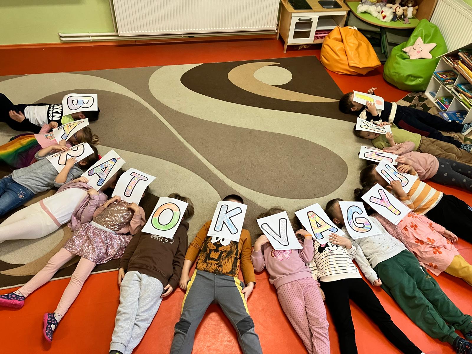 A tevékenységet közös színezéssel kezdtük, ahol kiszíneztük a “Barátok vagyunk!” feliratot. A gyerekek lelkesen válogatták a színeket, együtt alkották meg a nagy, díszes feliratot, majd ezt kiraktuk együtt. Ezután minden gyermek a kezében fogott egy-egy betűt a feliratból, így alkotva meg közösen a “Barátok vagyunk!” feliratot. Megbeszéltük, hogy mit jelent számukra ez a szó, és mikor érzik úgy, hogy valaki a barátjuk.