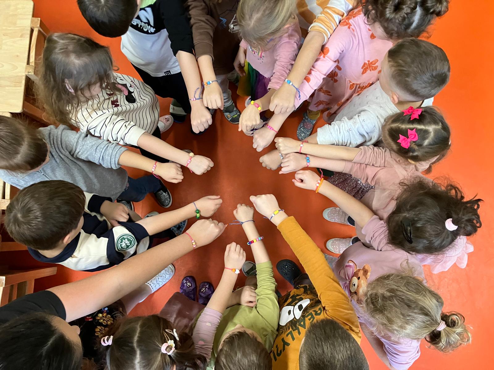 A következő tevékenység a barátság-karkötő készítése volt. Minden gyermek színes fonalakból és gyöngyökből saját kis karkötőt alkotott, amelyet aztán egy általuk választott párjuknak ajándékoztak. Nagyon megható volt látni, milyen örömmel adták tovább a gyerekek a saját készítésű ajándékot, sok kedves szó és mosoly hangzott el közben