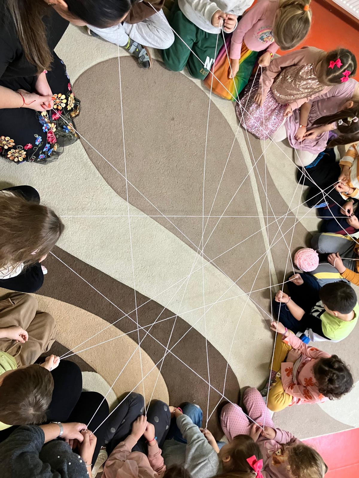 A tevékenységet a barátságháló elkészítésével zártuk. Körben ültünk, és egy fonalgombolyag segítségével alakítottuk ki a hálót, megneveztük a személyet, akinek dobtuk a hálót és kedves szavak mondtunk társunknak. Így lassan egy igazi, szimbolikus barátságháló született, amely összekötötte a csoport minden tagját.