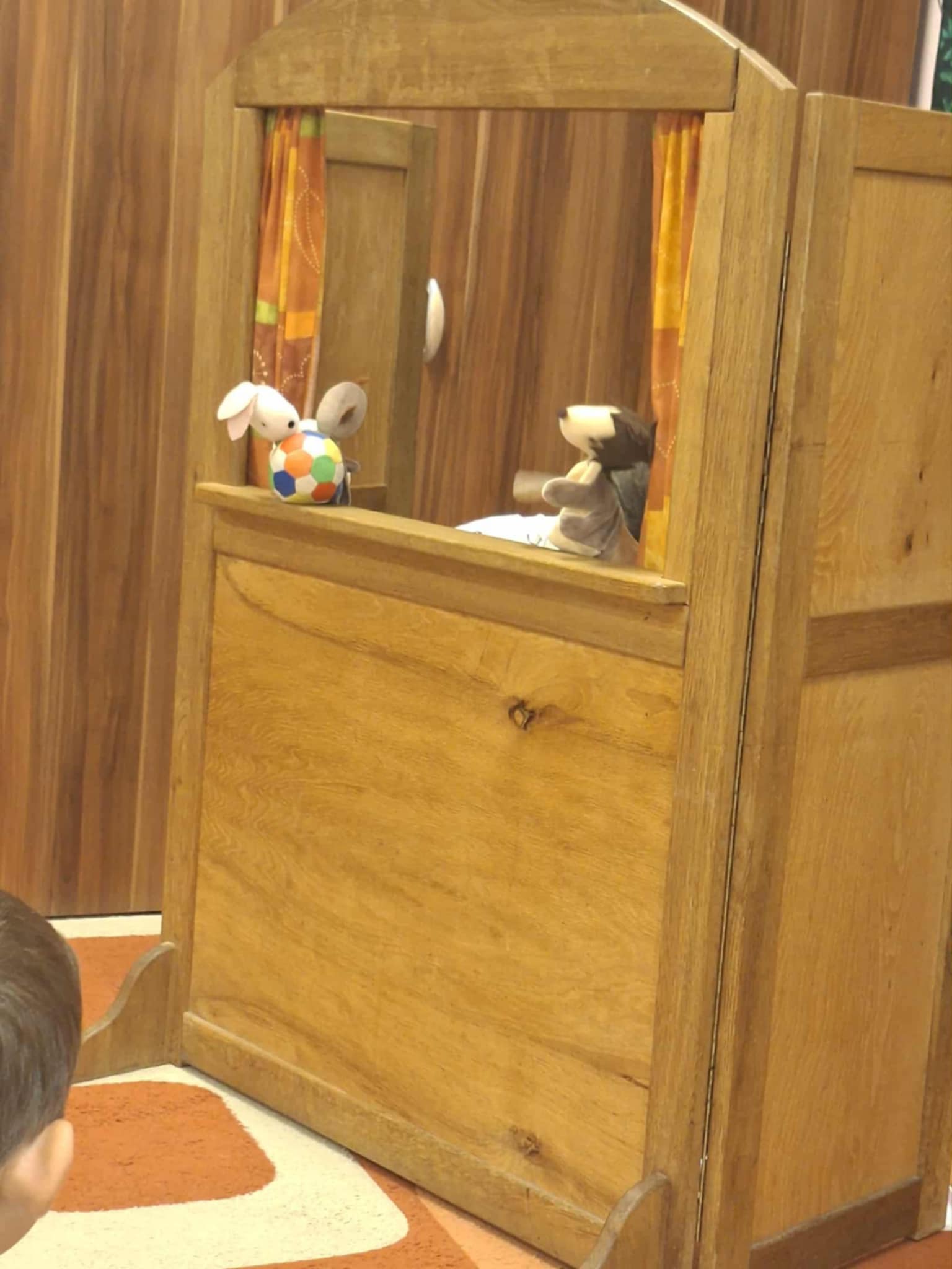 Én leültem a paraván mögé, és eljátszottam, a Süni irigy lesz című mesét a Boldogságóra könyvből. A mese után tettem fel nekik kérdéseket a mese kapcsán, majd megkértem őket, hogy válasszák ki a barátjukat és üljenek le a barátjuk mellé.