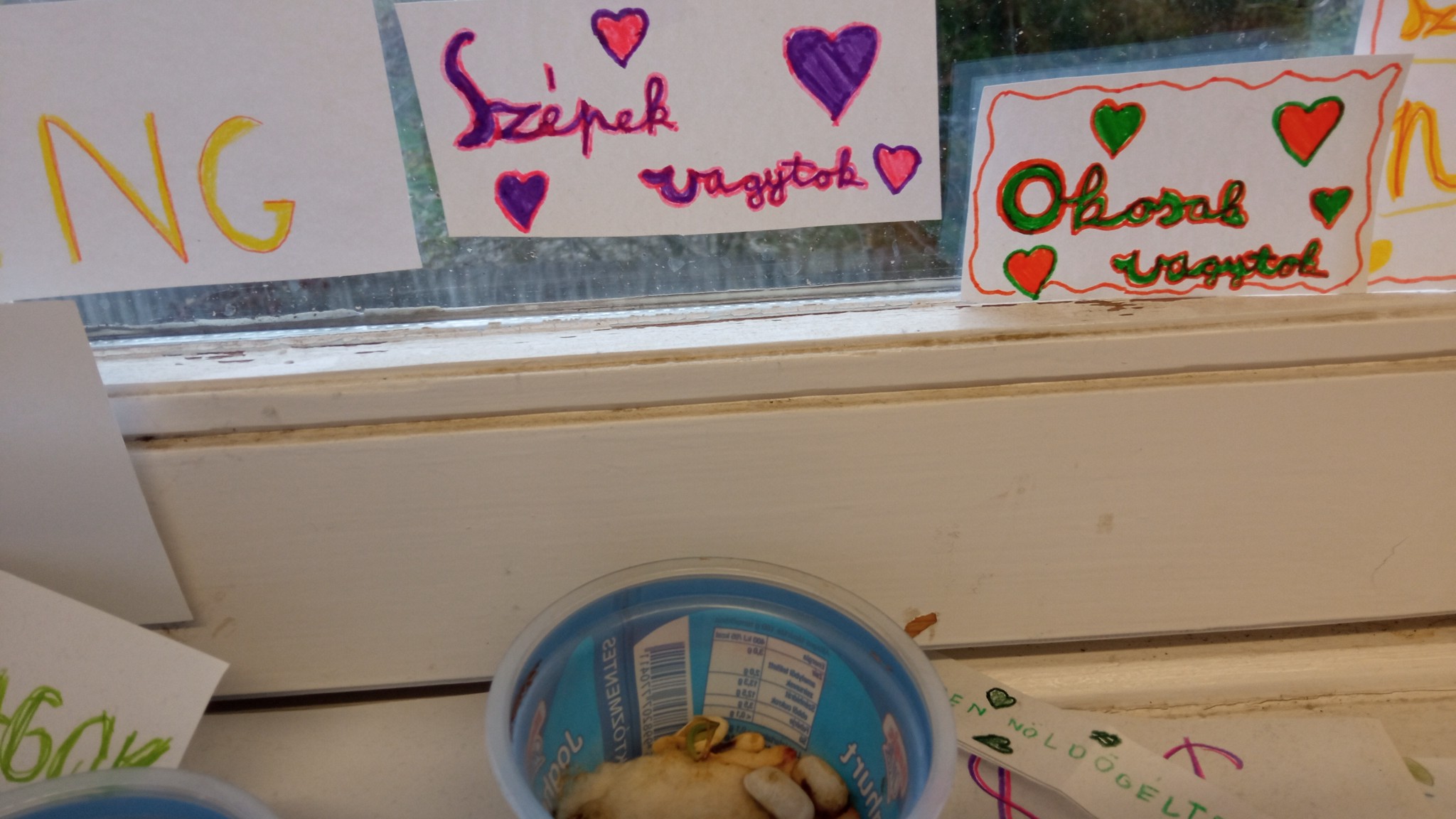 Első meglepetésemre azonban a gyerekek azt kérték, hogy nekik is készíthessenek gonosz névtáblákat. Másodjára az lepett meg, hogy a gonosz névtáblából sokkal több készült. Ezt el is mondtam a gyerekeknek, hogy emiatt én szomorú vagyok. Számomra is megmagyarázhatatlan, de a szeretet babok kezdtek elsőként csírázni. ( Ennek viszont én nagyon örültem.)