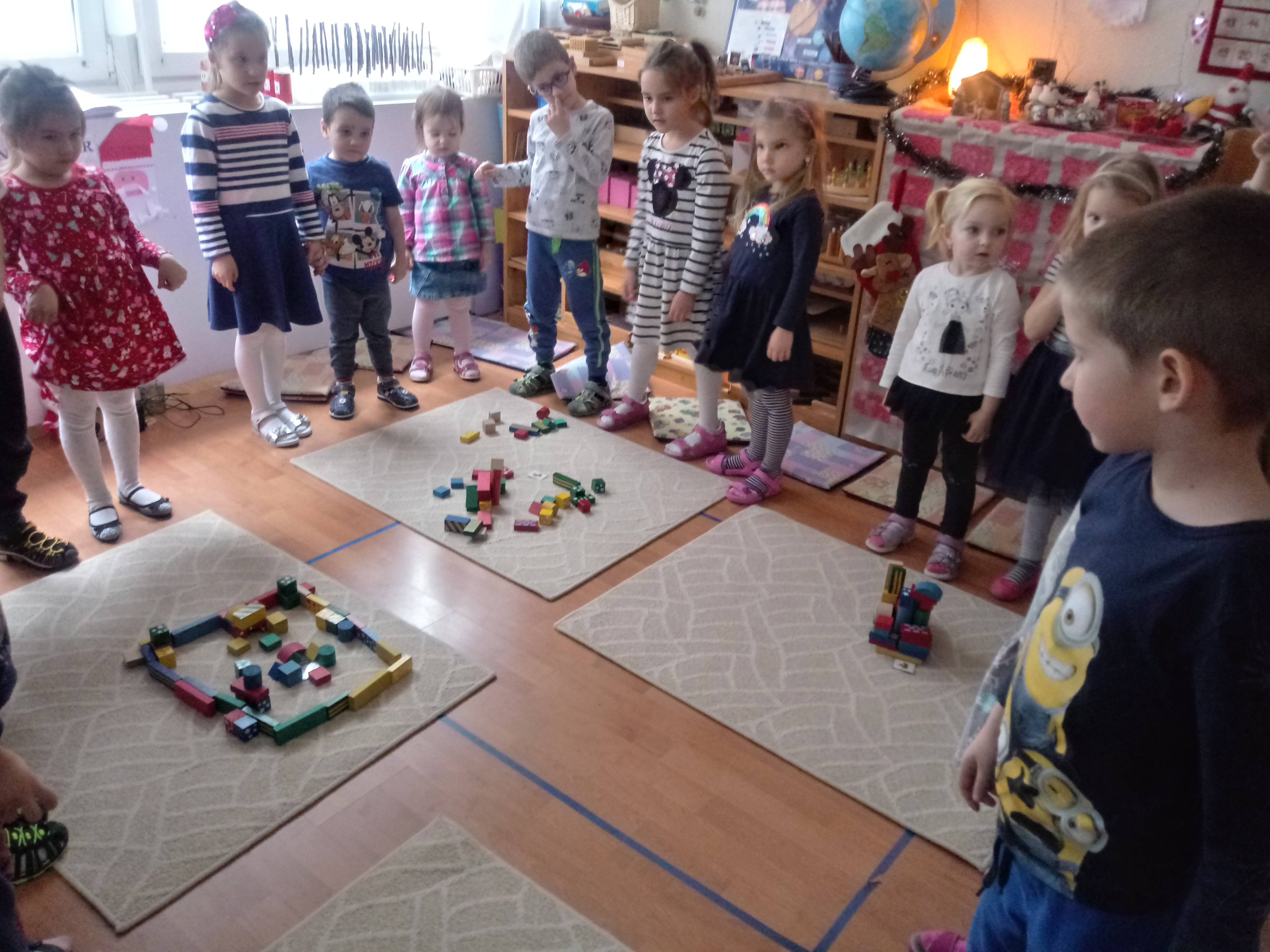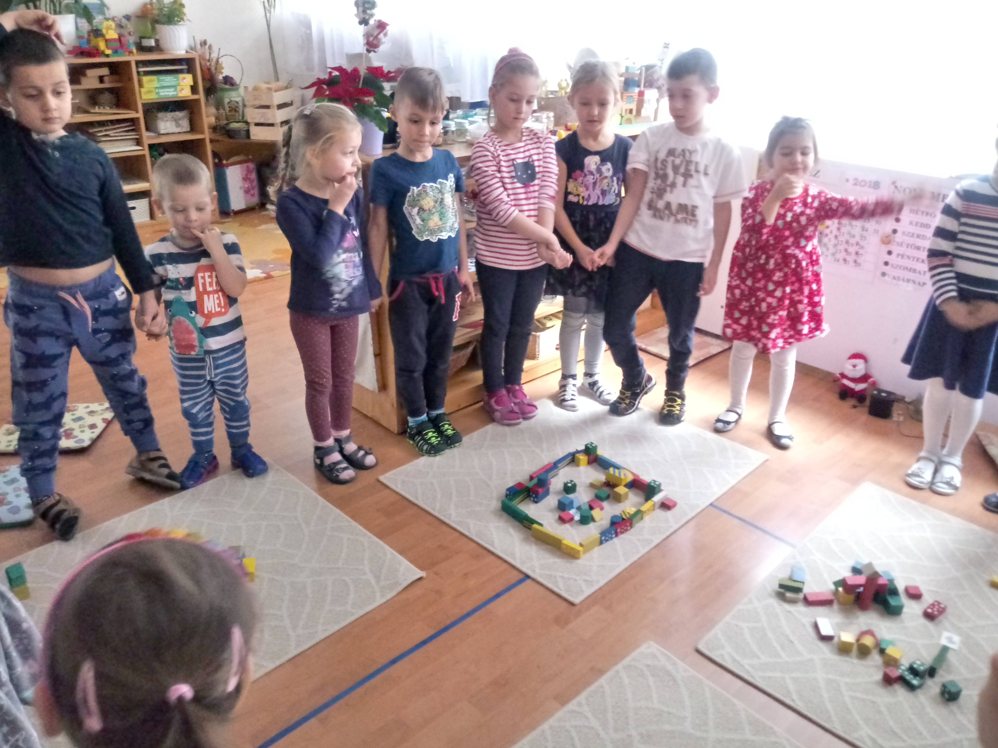 A november havi boldogságórán a barátságról és a társas kapcsolatokról beszélgettünk a gyerekekkel. Elmondhatták, hogy miért szoktak szomorúak lenni és ki szokta megvigasztalni őket. Megbeszéltük azt is, hogy jó érzés másokkal megosztani problémáinkat és milyen jól esik a társak vigasztalása, biztatása és segítése a bajban. Kitértünk arra is, hogy milyen módon tudjuk megvigasztalni a társainkat. A beszélgetést követően eljátszhatták azt a szituációt, hogy az egyik gyermek szomorú és a másik pedig megvigasztalja. Nagy lelkesedéssel vállalkoztak erre a feladatra és egymás között beszélték meg, hogy ki lesz a szomorú és ki fog vigasztalni. Végül négy kis szőnyegen négy csapatot alkottunk: hópehely, falevél, pillangó és labda jelű csoportokat. A szőnyegeken színes kockák sorakoztak, amelyekből közösen alkothattak építményt. A munka végeztével elmondhatták véleményüket az elkészült alkotásokról. Nagyon tetszett a gyerekeknek a foglakozás, örömmel vettek részt a játékokban.
