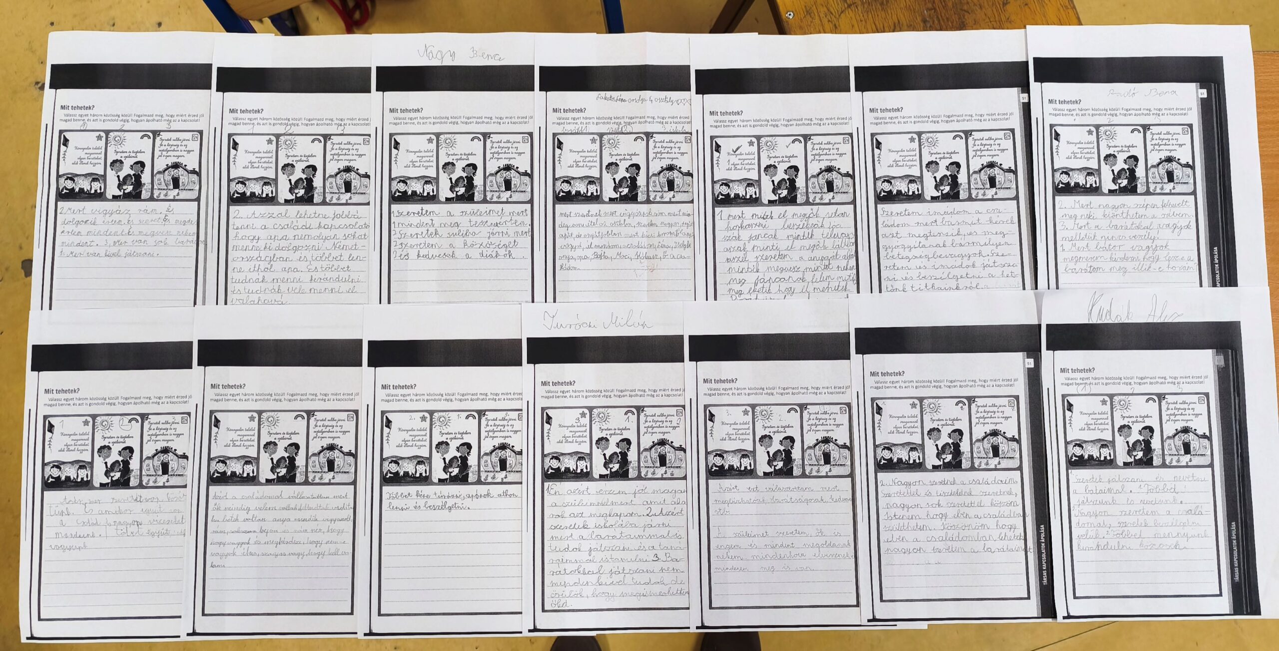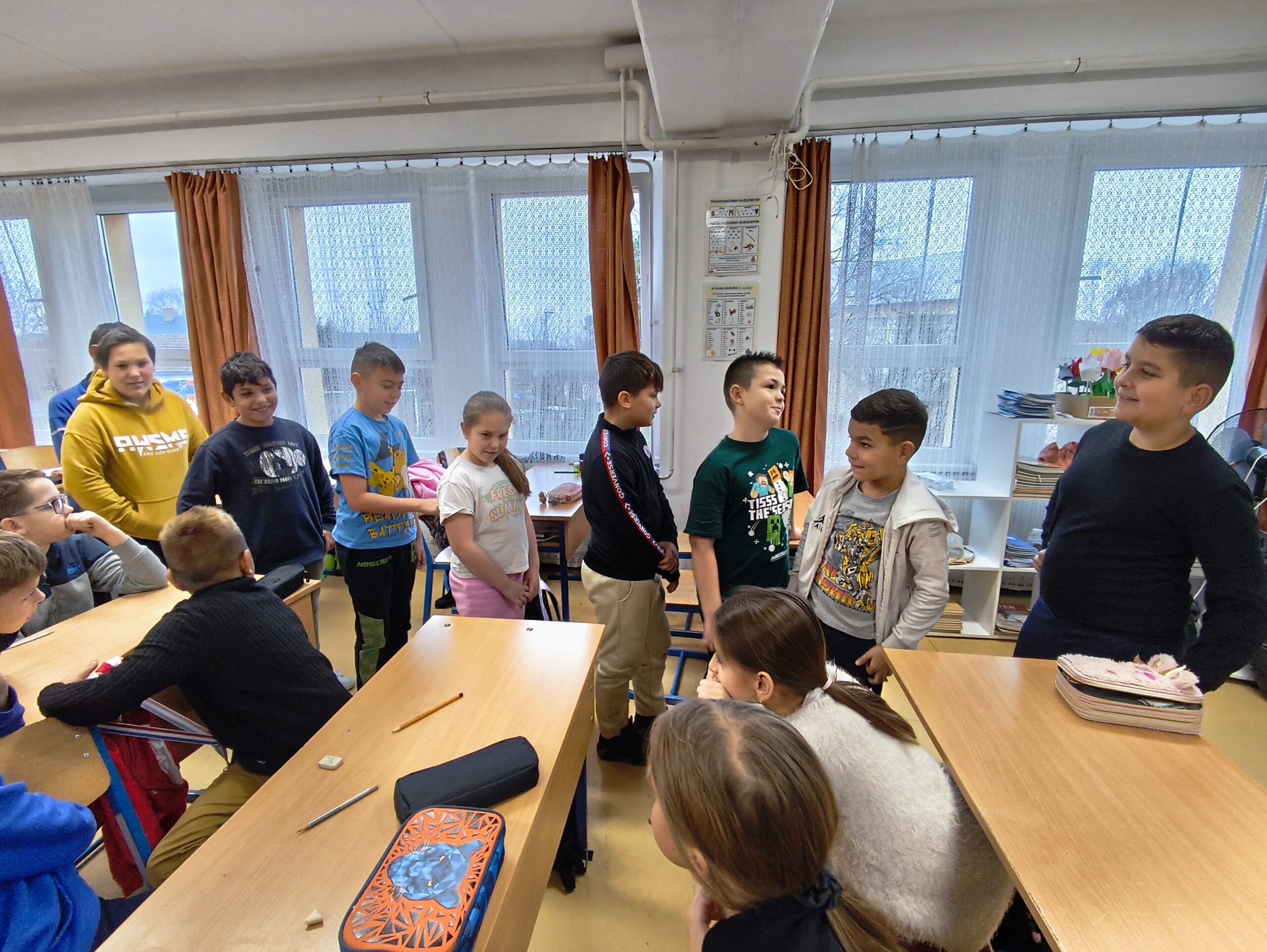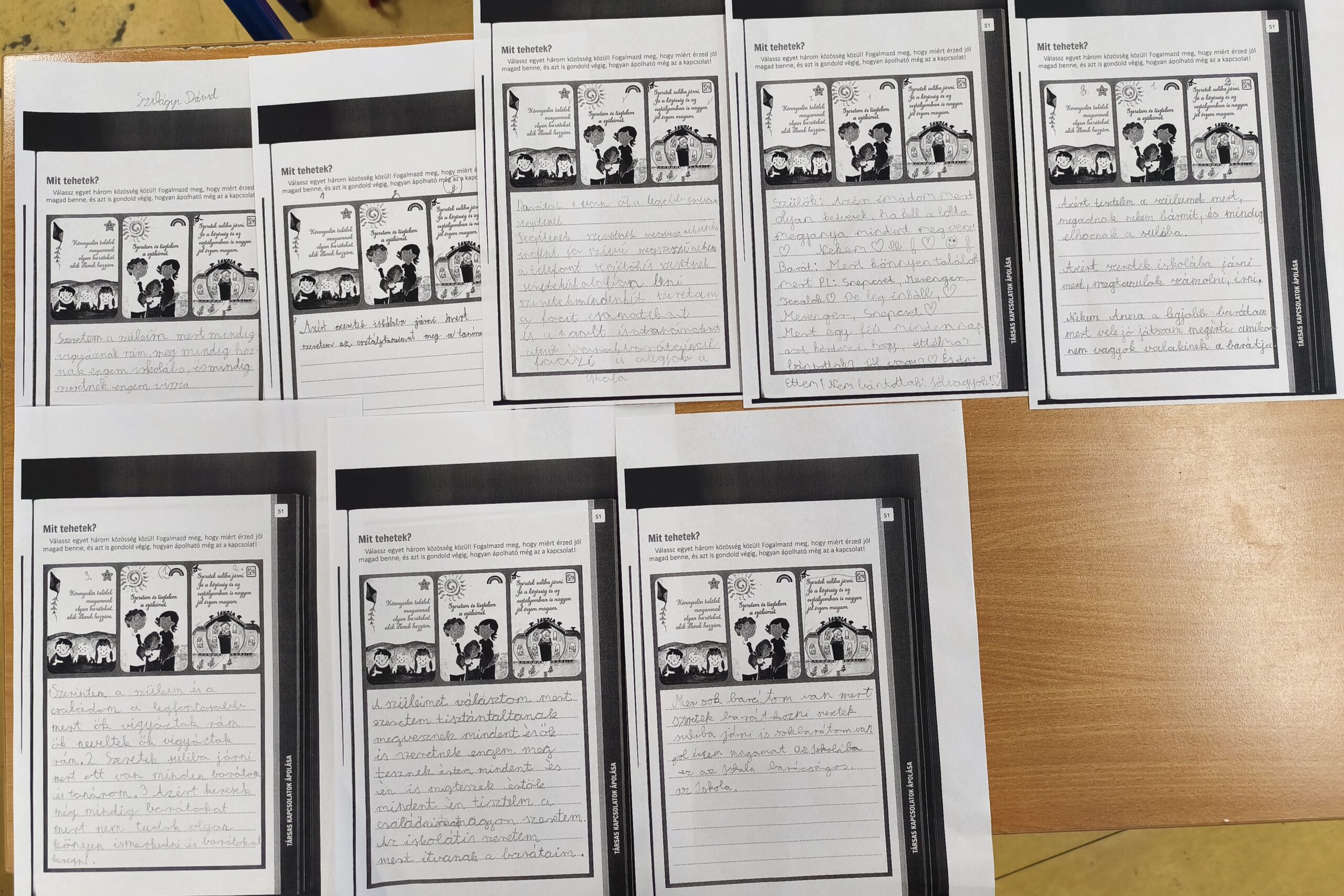 Az óra elején a hónap dalát hallgattuk meg, ahol a hangulat felszabadult, örömteli volt. Majd beszélgettünk arról, ki milyen közösségekben ápol kapcsolatot, hogyan? Rögtön mondták, hogy család, iskola, barátok csoportokhoz tartoznak. Itt beszéltek arról, ki hogyan ápolja a kapcsolatait. Az internet veszélyeiről is beszéltünk ezáltal, hiszen a leggyakoribb módja a beszélgetésnek valamilyen platformon való chat. Gyönyörűen megfogalmazták a gondolataikat, hogy a személyes kapcsolatnak, érintésnek miért van fontosabb szerepe az életükben.