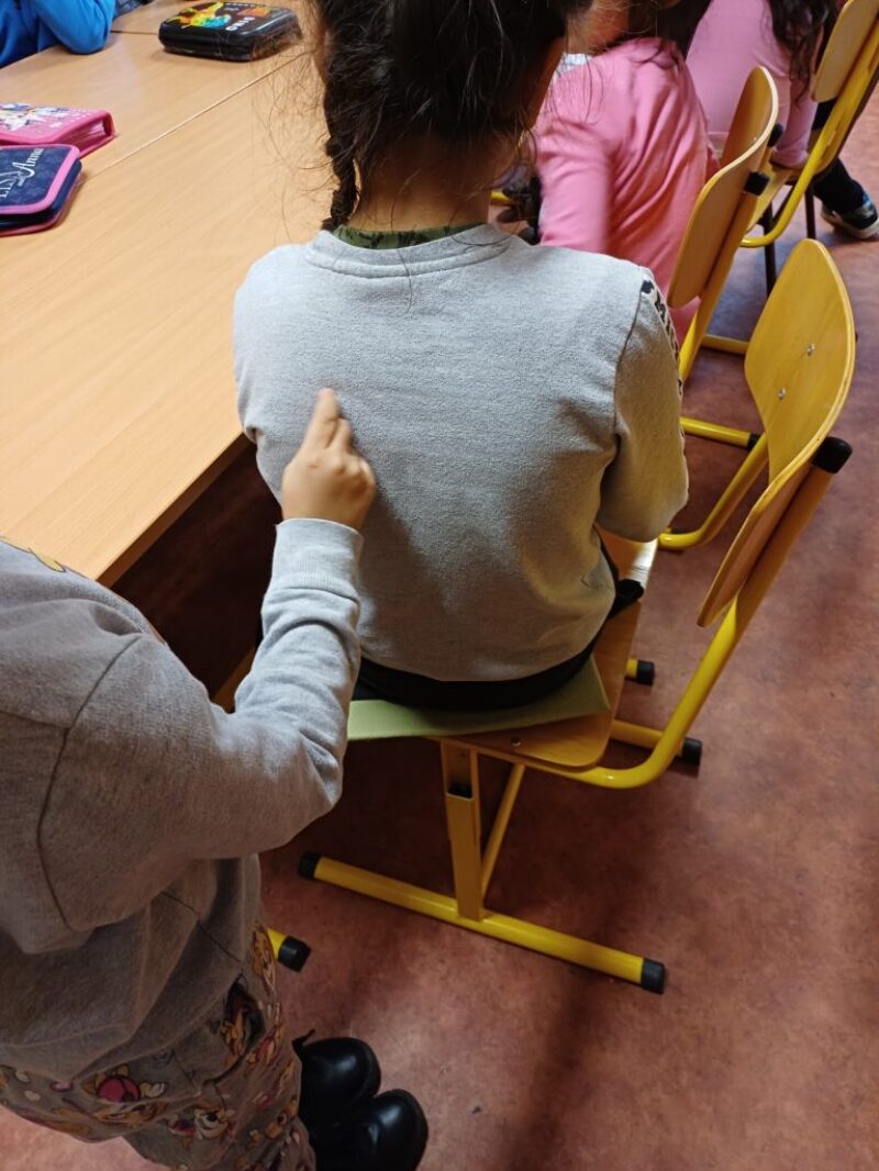 A bevezető beszélgetést követően egy játékos feladatot végeztünk: a „Távíróoszlop” játékot. A gyerekek körbe ültek, és egymás hátára rajzolva továbbították a „titkos üzenetet”. A játék célja az volt, hogy a tanulók megtapasztalják az együttműködés örömét, valamint azt, hogy a kapcsolatokhoz odafigyelés és türelem szükséges.