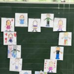 A beszélgetés után minden gyermek lerajzolta önmagát, majd ezeket a rajzokat közösen egy nagy osztályszív formájába rendeztük a táblán.