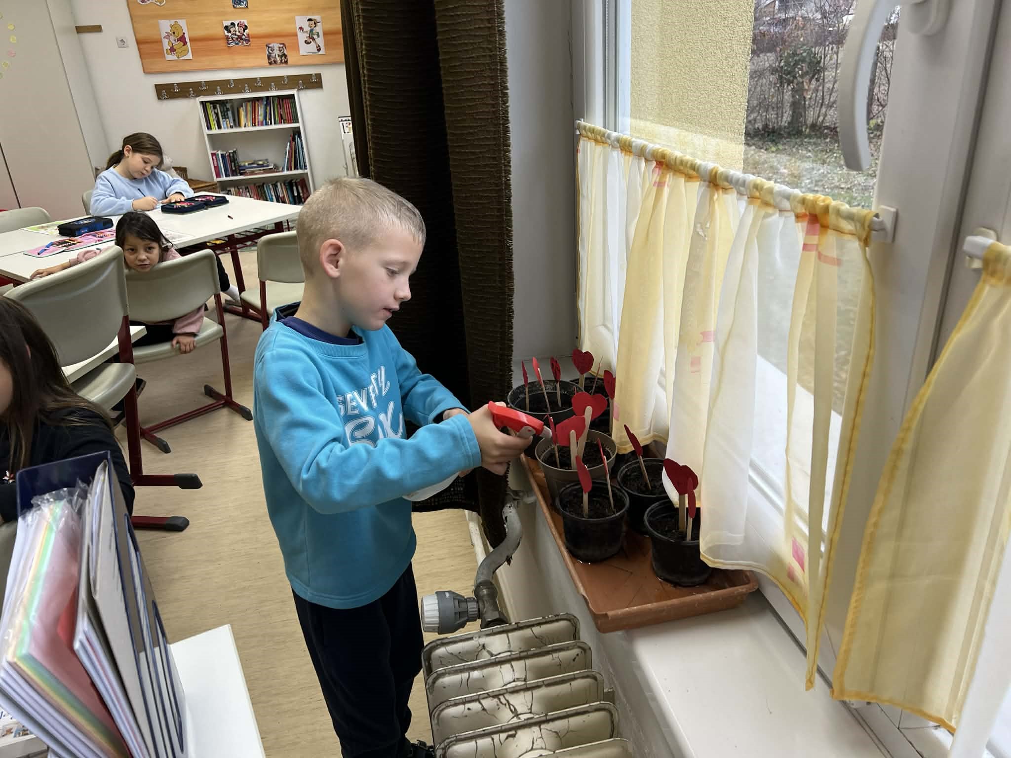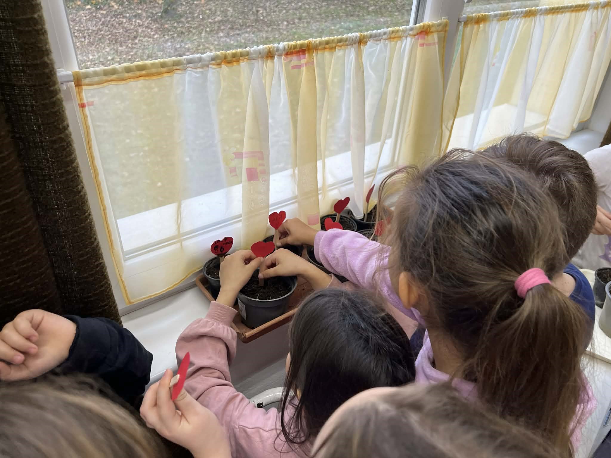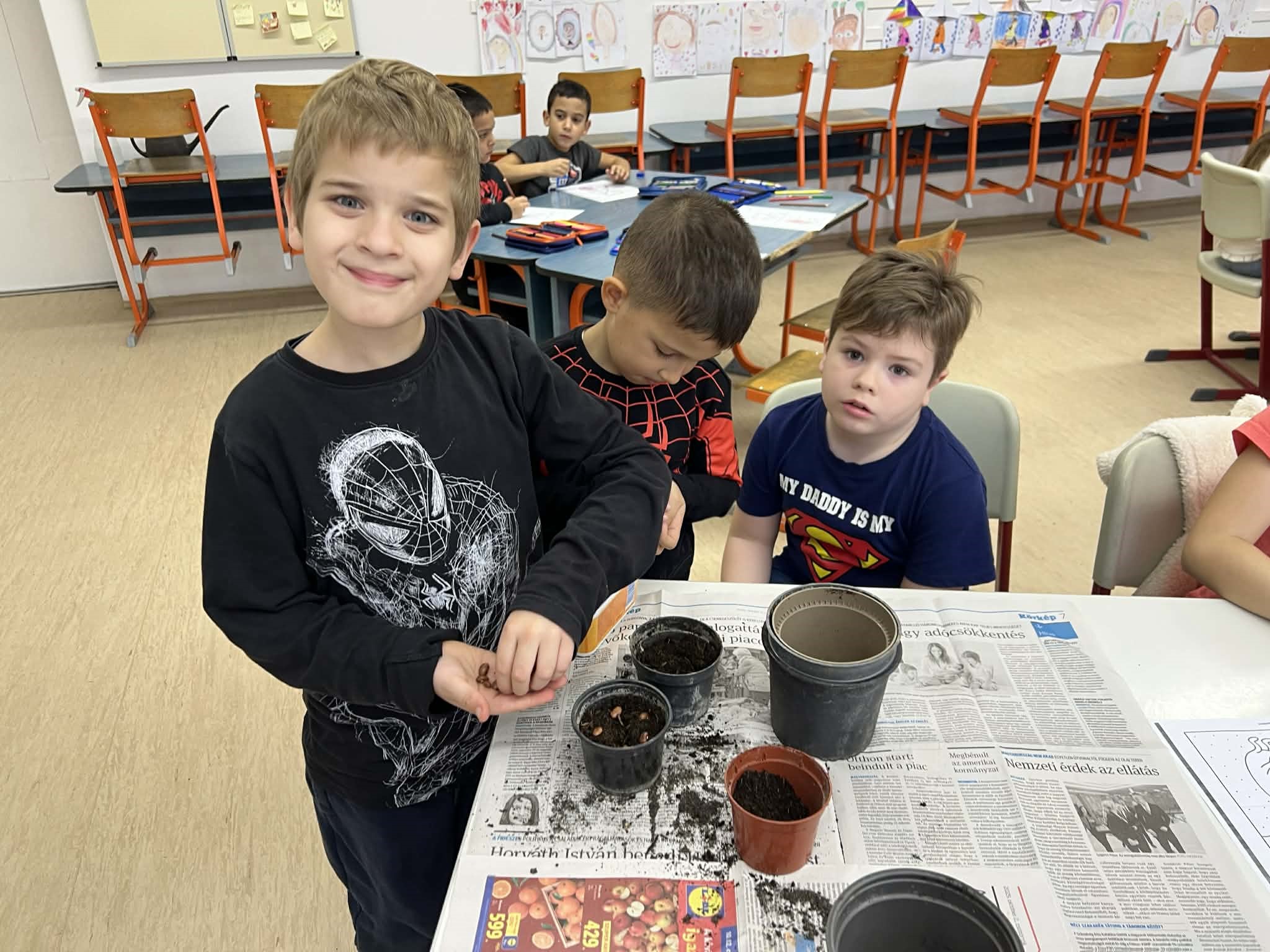 Az egyik legizgalmasabb foglalkozás a Babkísérlet volt. Minden gyerek saját virágcserepet kapott, amelybe babszemeket ültettünk. Kiválasztottuk a „Szeretet babokat”, amelyeket külön gonddal, kedvességgel ápolunk majd, szívecskékkel díszített virágkaróval jelöltük, és a „Csendes babokat”, amelyeket csak az alapvető törődésben részesítjük. A gyerekek így saját élményen keresztül tapasztalták meg, milyen hatalmas ereje van a szeretetnek, odafigyelésnek és gondoskodásnak – ez a tanulság mélyen beépül a társas kapcsolataikba.