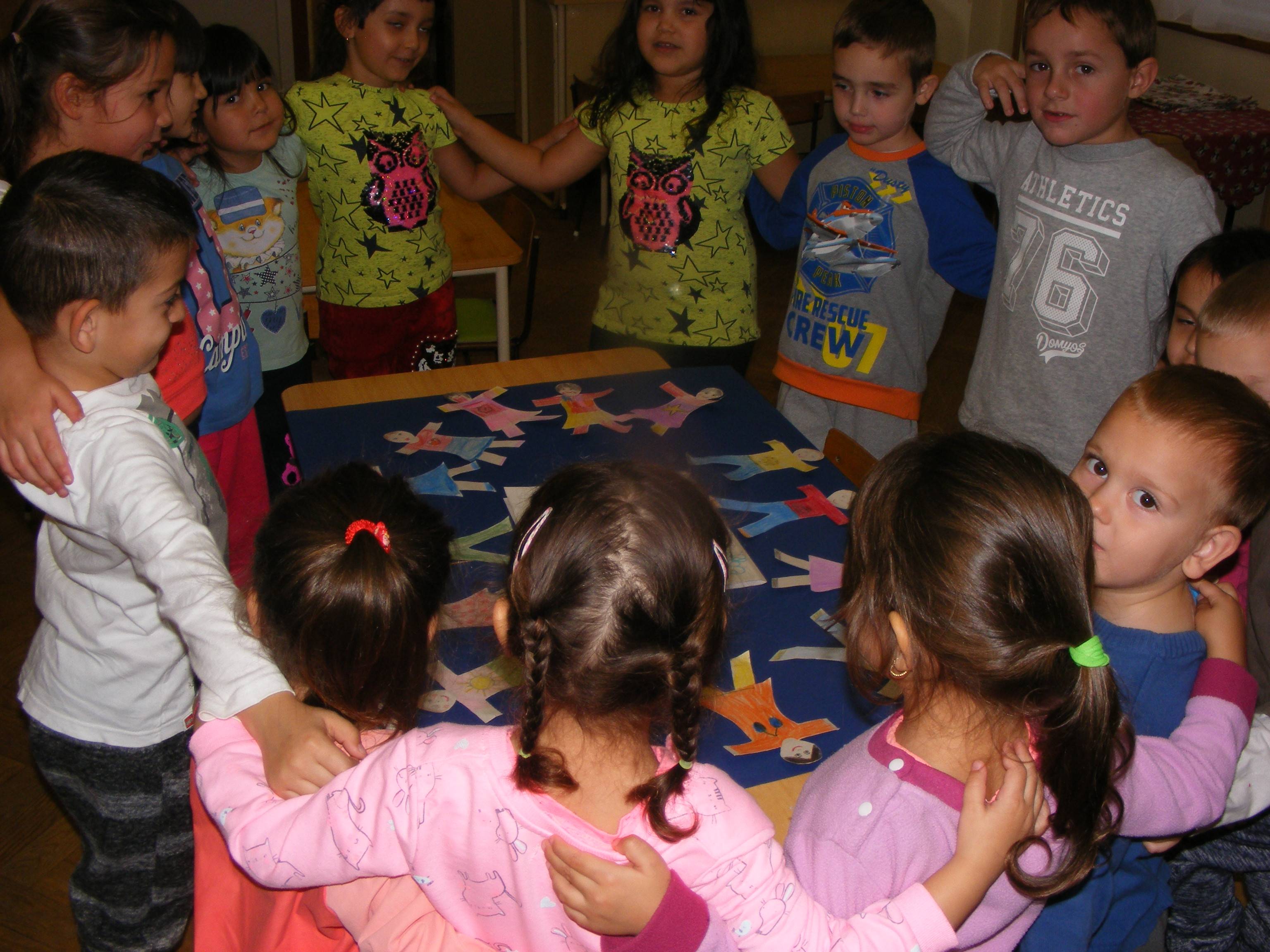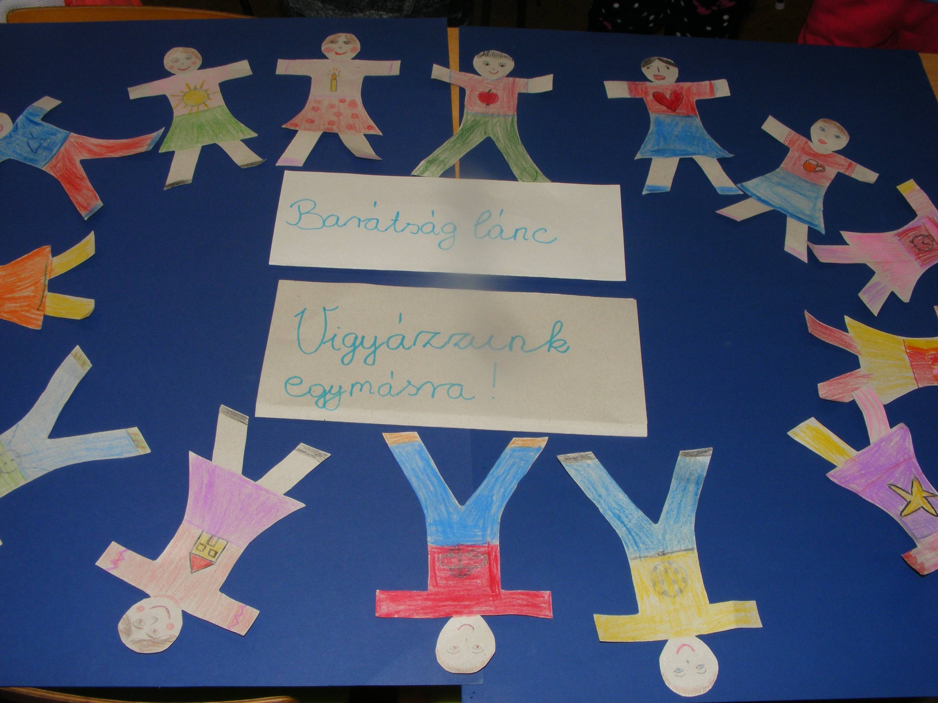 A barátságháló szövésével kiderült, hogy ki kinek a barátja,majd együtt játszottak.. Beszélgettünk arról, hogy miért fontosa barátság?! A jó barát ismertetői milyen tulajdonságok lehetnek? Felhívtam a gyerekek figyelmét a belső értékekre a szerethetőségre. Emberformákat színeztünk saját képmásukra, barátságláncot készítettünk belőle. A gyerekek szeretik ha vannak barátaik és barátaik lehetnek másoknak. Ha valakit bántanak megvédik, segítséget hívnak és megígérik, hogy vigyáznak egymásra. Bagdi Bella: Ha boldog vagy című dalára jókedvűen táncoltunk, énekeltünk.