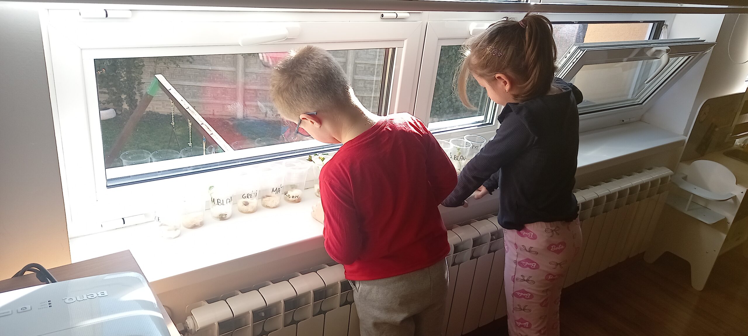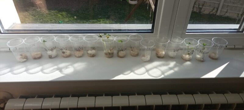 A természet ébredése tavasszal mindannyiunkat örömmel tölt el. Az „apró örömök” témájához kapcsolódva a gyerekekkel babot csíráztattunk, és nap mint nap figyeltük, hogyan fejlődik a növény. Nagy izgalommal várták az első hajtások megjelenését, amely sok örömet okozott számukra. Így saját élményen keresztül tapasztalhatták meg a tavaszi megújulást és a növekedés folyamatát