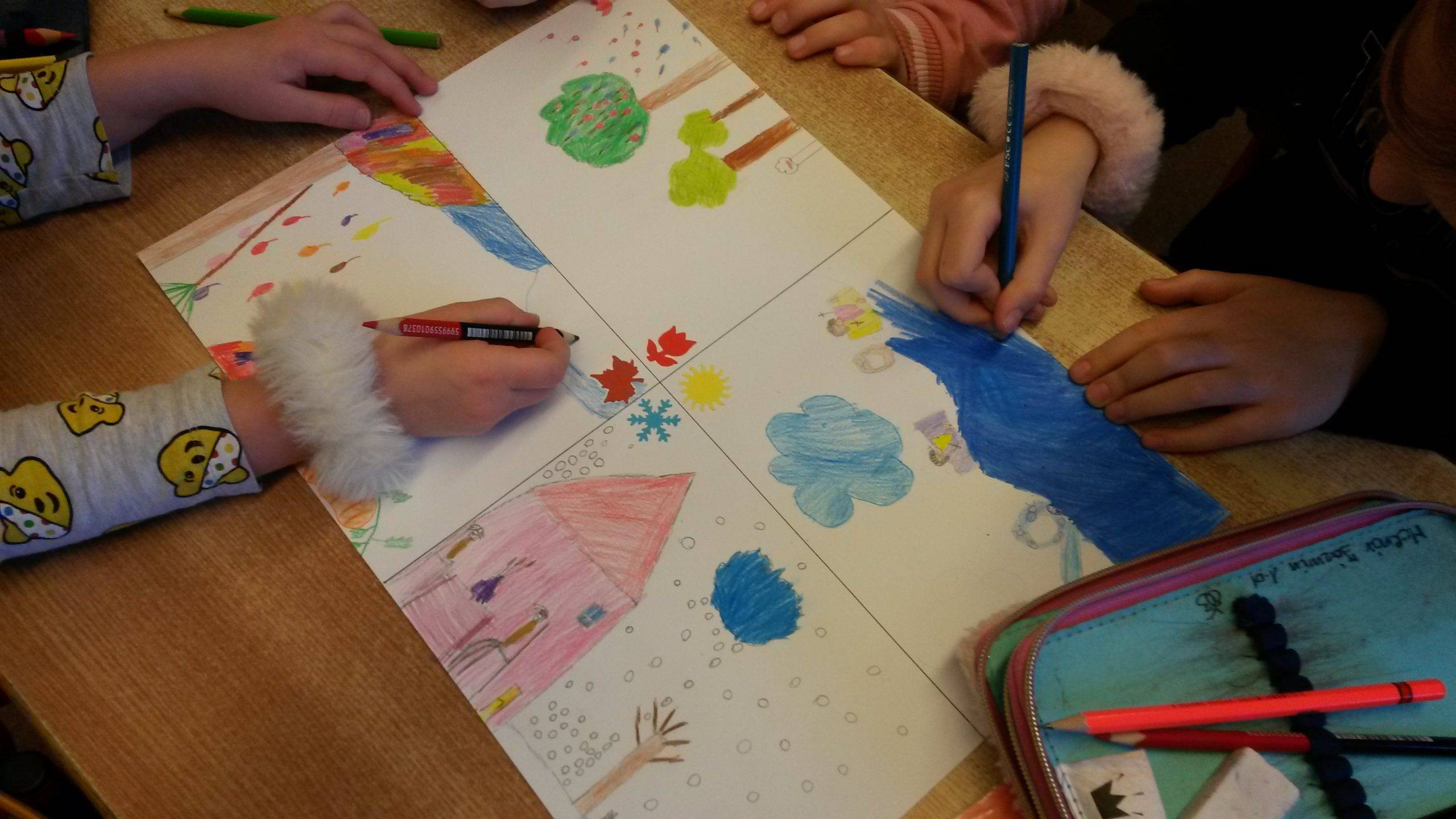 Első osztályos csapatunkkal a boldogságórák megvalósításakor mindig nagyon sok tevékenység központú módszert alkalmazunk. Az Apró örömök témakör adta magától, hogy az érzékelés-észlelés előtérbe kerüljön. Mivel évszakforduló is van ebben a hónapban, a télből a tavaszba lépünk, elsőként az évszakok nyújtotta apró örömöket elevenítettük meg rajzos formában, csoportmunkában. Majd az érzékszervek megismerése után tavaszi örömfát készítettünk. Napokig figyelték tanulóink, hogy milyen apró örömök érik őket. Aztán összegzésként mindenki felragaszthatta az örömfára az őt ért apró örömöket. Bevettük a hónapba a Víz világnapját is, ahol óriásplakáttal ünnepeltük az éltető vizet. Nagy segítségünkre szolgáltak ebben a hónapban a Pozitív gyerek vagyok személyiségfejlesztő kártyák, illetve Bagdi Bella dalai. A hónap végén, jó időben a gyerekekkel a természetben élveztük az apró örömöket, amelyeket rögzítettek is a feladatlapon.
