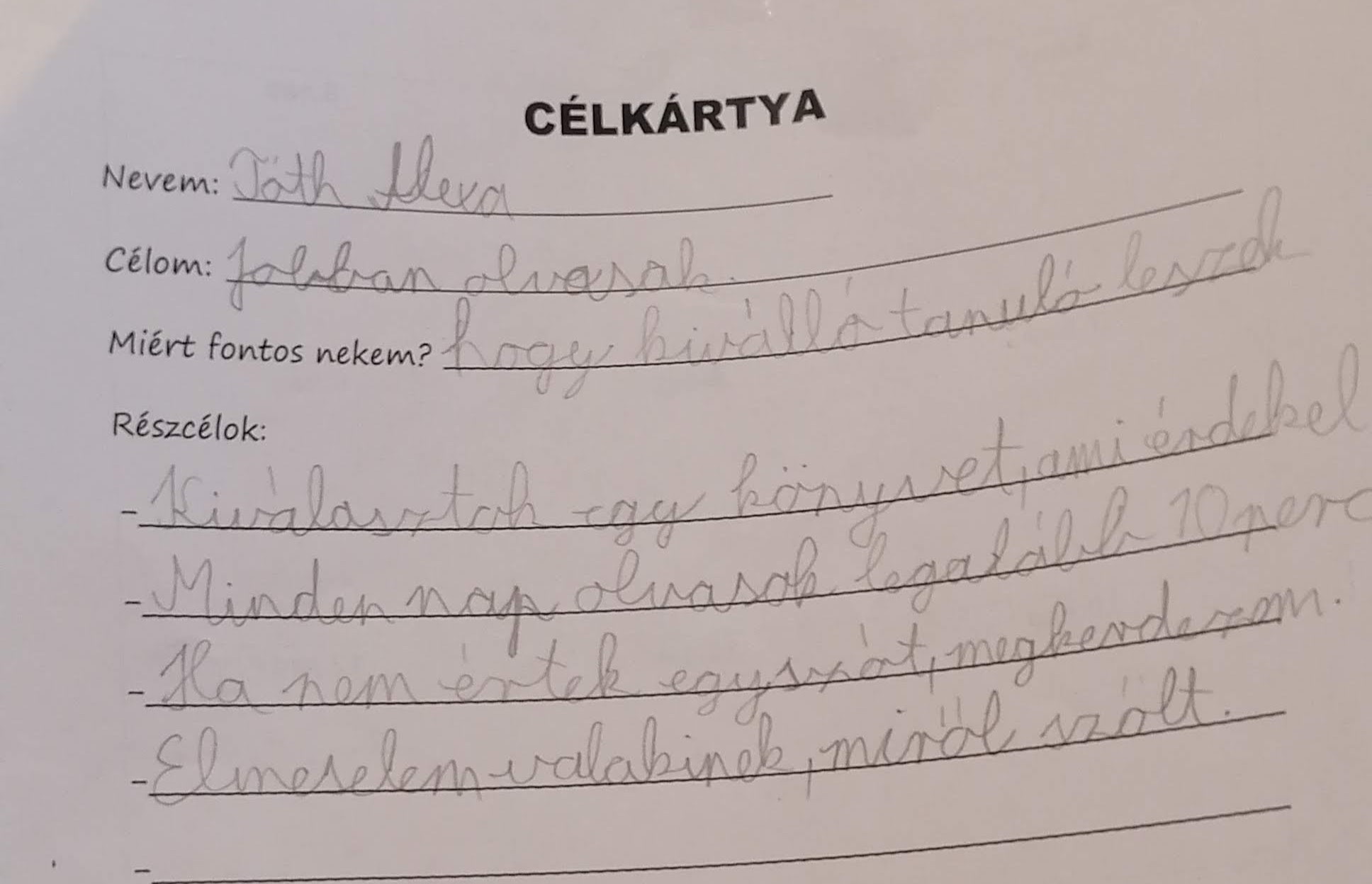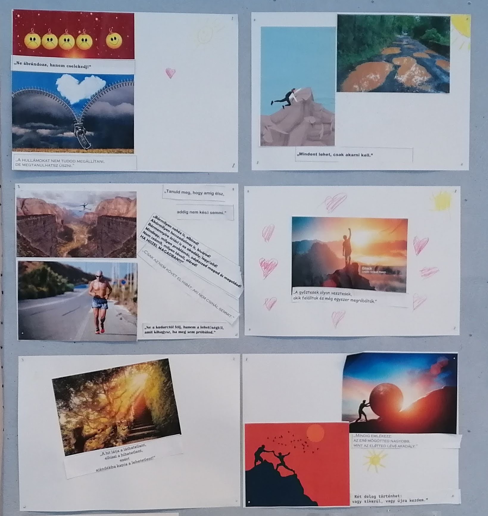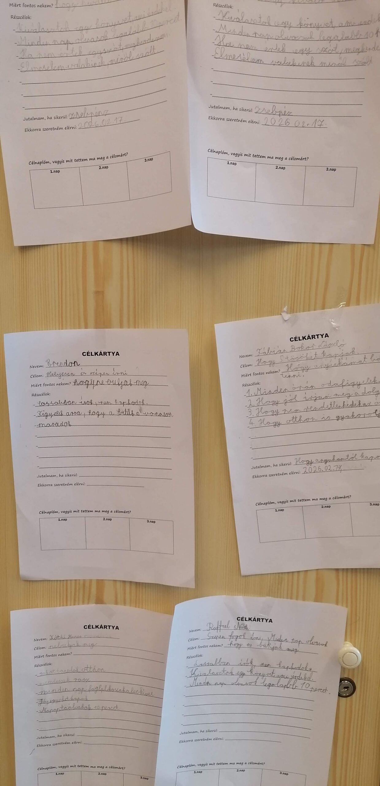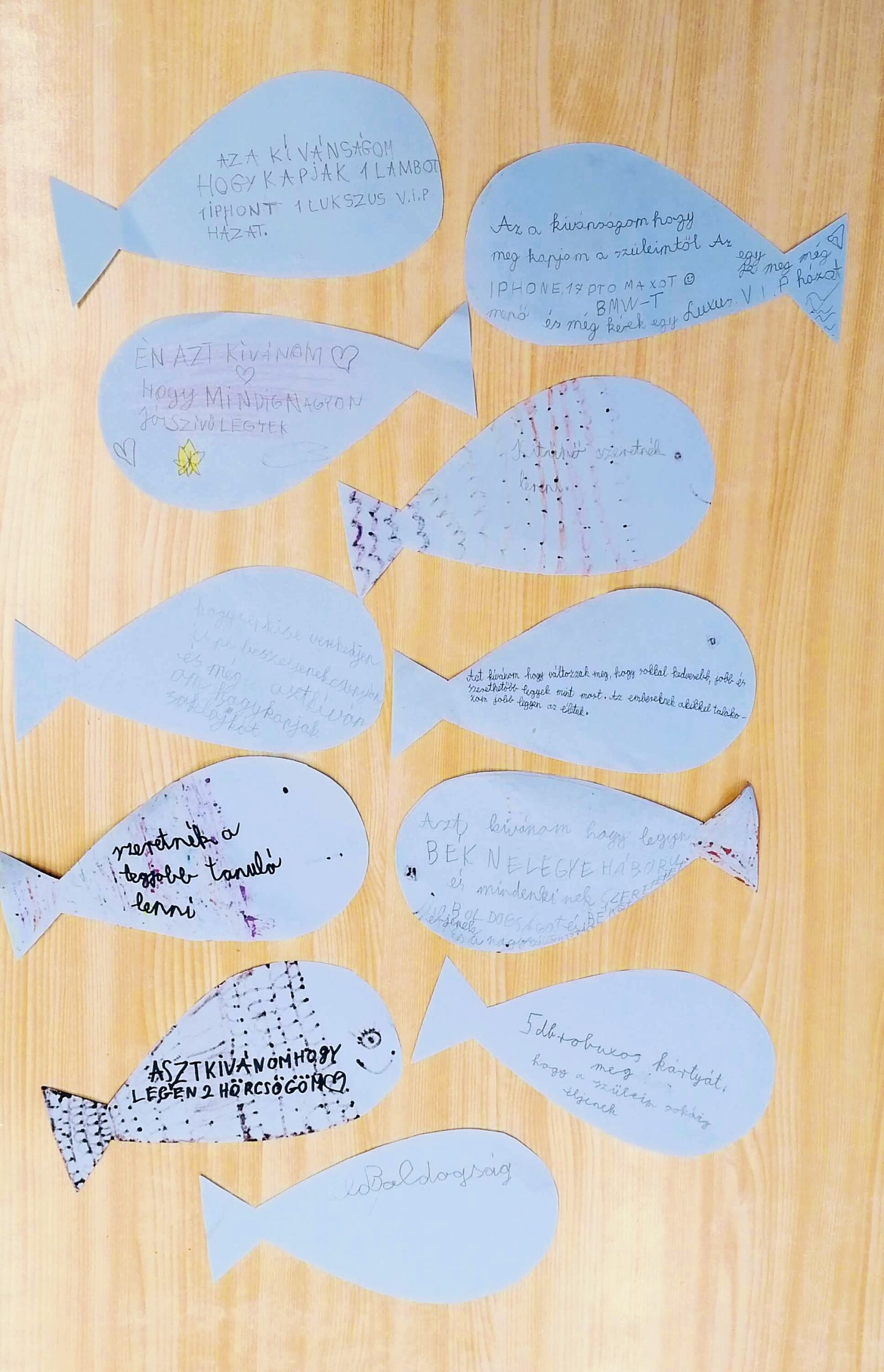 Januári boldogságóránkat egy mesével kezdtük. Az öreg halász és nagyravágyó felesége c. mese kapcsán kis halacskákra írhatták a gyerekek a saját kívánságaikat. Ezután megbeszéltük a mese tanulságával összefüggésben, hogy a leírt kívánságok közül melyik lehet olyan cél, amit kellő kitartással és akaraterővel, valamint belefektetett munkával meg is lehet valósítani. Második alkalommal a motiváció volt a témánk. Először mozogtunk, táncoltunk Bagdi Bella: Van nekem egy álmom c. dalára, majd leültünk a szőnyegre és a szivárványlégzéssel ráhangolódtunk az Önbizalomhegy – motiváló jövőkép c. meditációra. Ezt követően a táblára kivetítettem az Önbizalom Program munkafüzetében található keresztrejtvényt, melynek megfejtése a motiváció. Nagyon ügyesen és gyorsan megfejtették a gyerekek. Megbeszéltük, hogy mi a különbség külső és belső motiváció között, majd azt a feladatot kapták a gyerekek, hogy az asztalon lévő sok-sok motiváló képből és idézetből válasszanak maguknak olyat – akár többet is – ami szimpatikus és segítené őket a saját céljaik elérésében. A képekből és idézetekből plakátok készültek. Harmadik alkalommal célkártyákat készítettünk, melyen szerepelt a nevük, céljuk, részcéljaik, határidő, jutalom, ha sikerül elérni a célt, és egy 21 napos napló, amibe minden nap tudják jelölni, hogy adott napon mit sikerült tenniük a céljukért. Páronként kaptak egy kis ötletgyűjteményt is, hogy akinek semmi nem jut eszébe, az is tudjon valamit írni. A kész célkártyákat felragasztottuk a szekrényajtóra, hogy minden nap tudjuk vezetni a naplót. Ezután felbontottuk a tavaly eltett időkapszulát, és felolvastuk azt a levelet, amit egy éve fogalmaztunk meg saját magunknak. Nagyon tanulságos volt!