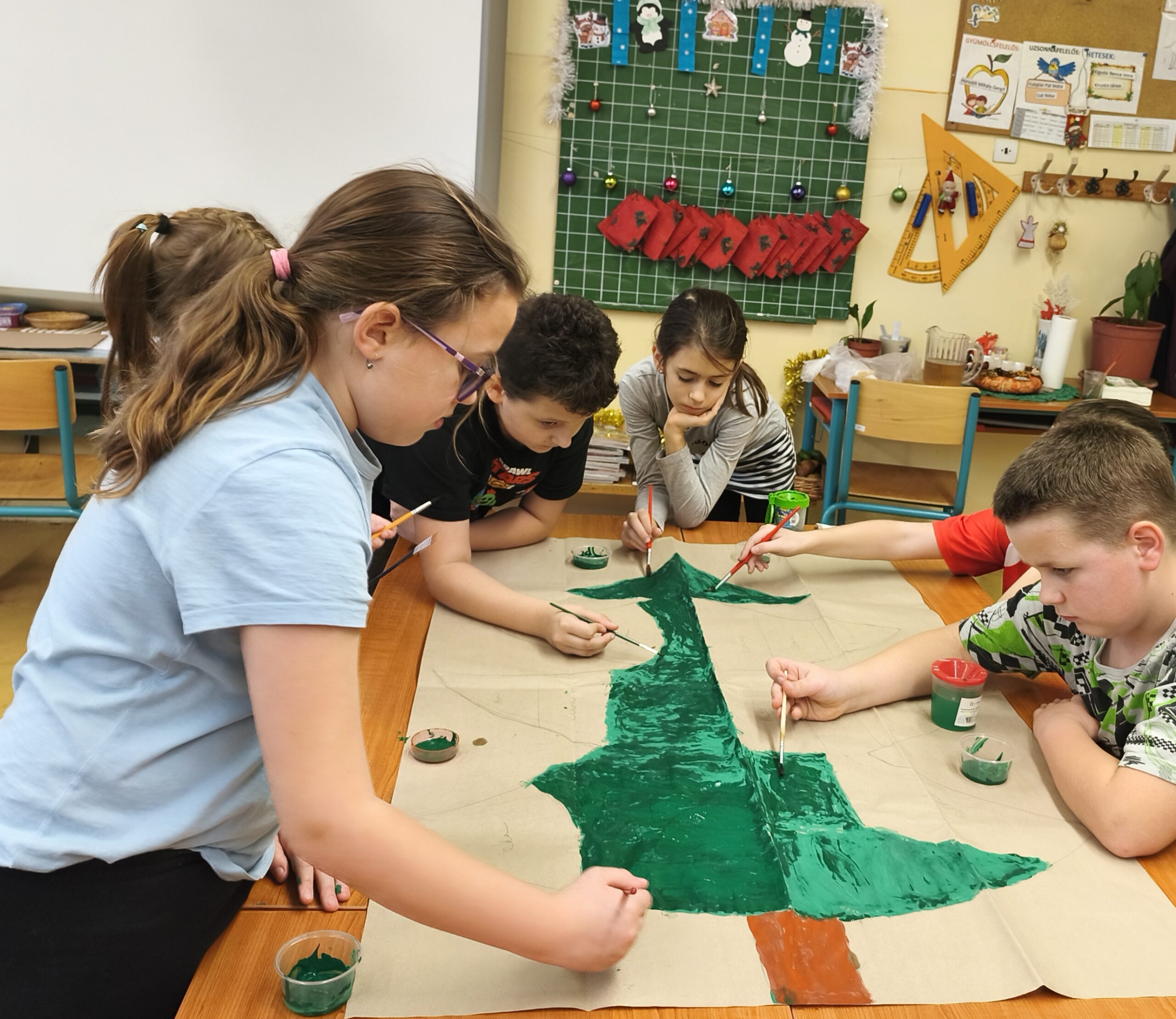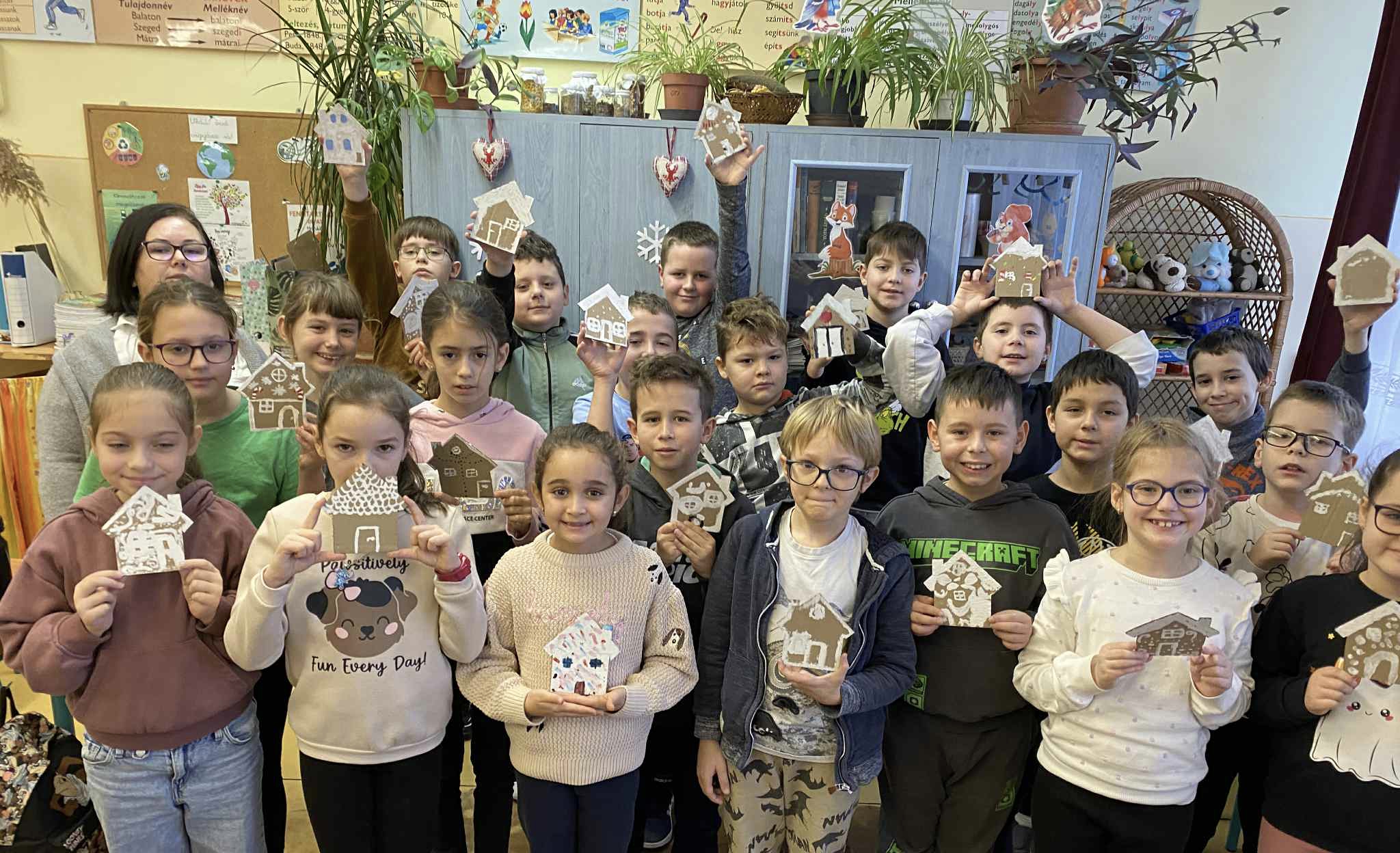 Mézeskalács házikókat készítettünk ajándékba, újra hasznosítva kartonpapírból. Csomagolópapírra megfestették a közös karácsonyfánkat, melyekre olyan díszeket ragasztottak, amire előtte jókívánságokat írtak egymásnak. Egész hónapban odafigyeltek, arra hogy jót tegyenek egymással, segítsék egymást.