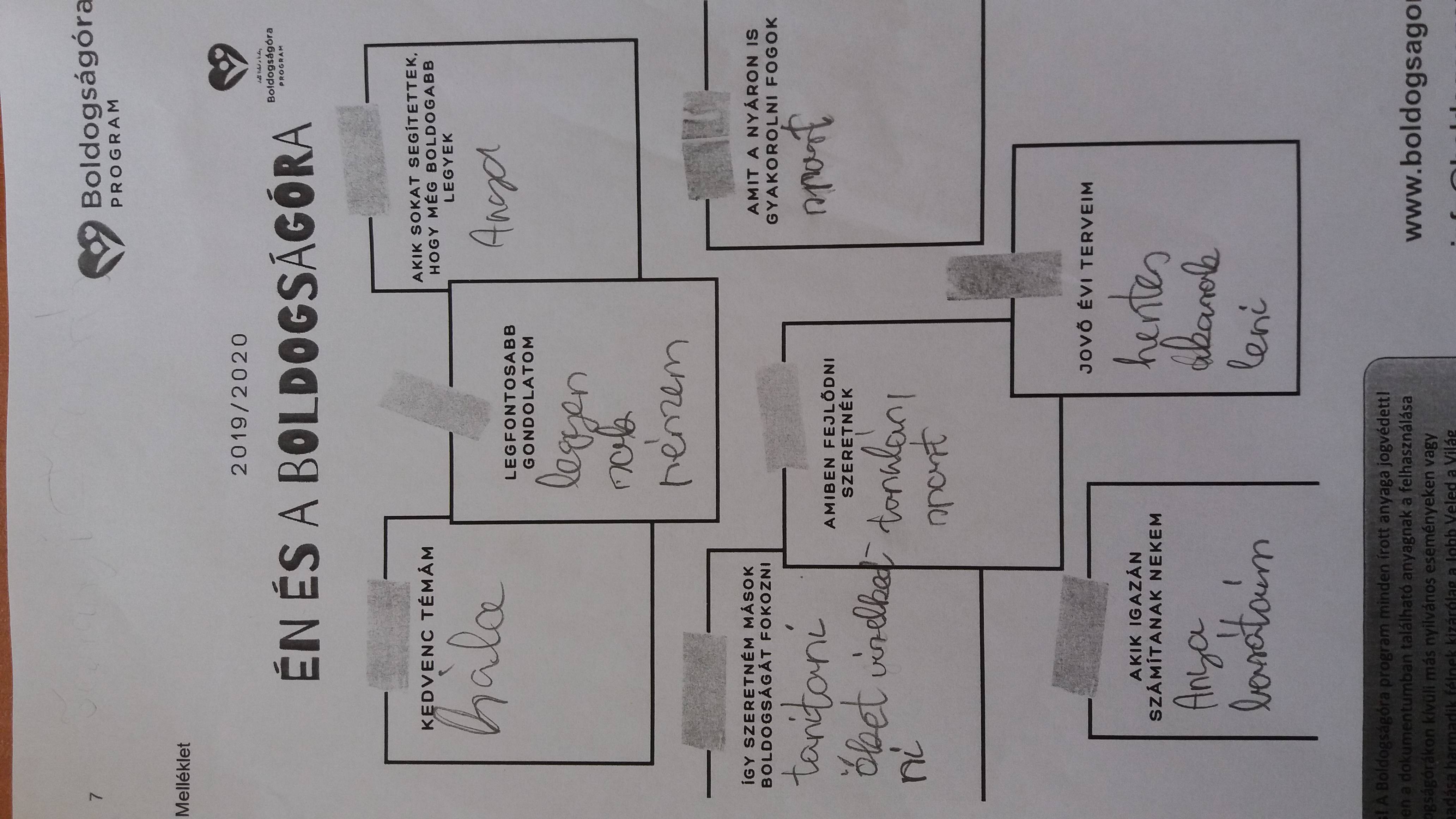 Megpróbáltuk feleleveníteni az elmúlt 9 hónap témáinak emlékeit. Leírtuk, hogy milyen gondolatokat indítottak el bennünk az emlékek. A 10 hónap során mi is részesei voltunk annak, hogy : „JOBB VELED A VILÁG!” A boldogságórák élményei nyomán a jövőbe vetett hitünk és életszeretetünk is mind hozzájárulnak ahhoz, hogy boldogságra képes felnőtt válhassunk:)
