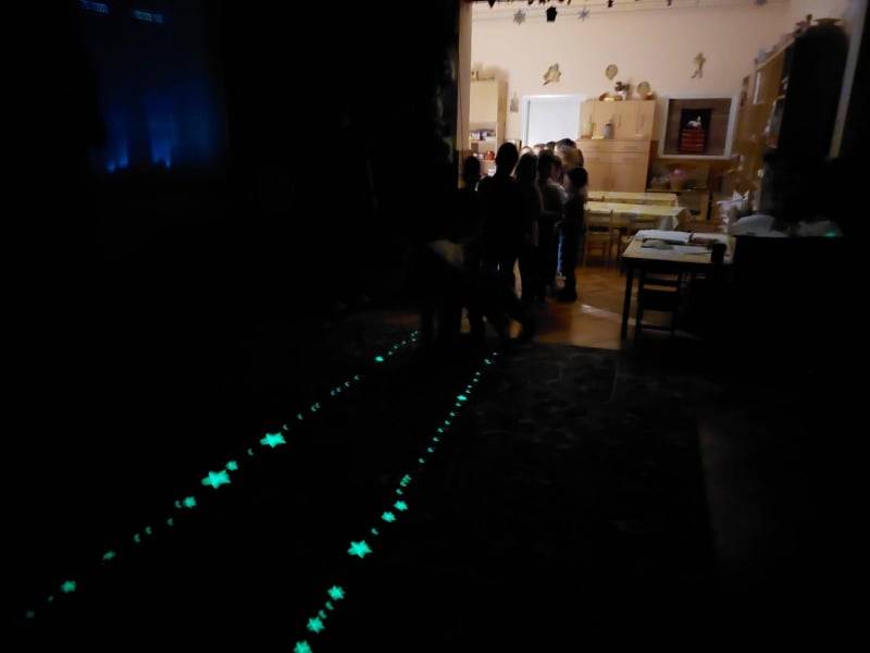 Egy mozgásos játékra hívtuk a gyermekeket, ahol egy mesés történetbe ágyazva feladatokat kellett teljesíteni minden gyermeknek, ahhoz, hogy eljussunk a mesebeli várba, a cél az volt, hogy minden gyermeknek sikerüljön teljesíteni minden feladatot. A feladatok egy része a csoportszobában volt, egy része a szabadban. Csillagokat követve mozogtunk a sötét csoportszobában, hógolyóval célba dobtunk, átkeltünk a veszélyes vízen, melyet a csillagok világítottak meg, majd követtük a csillagutat. Ebben segítettük egymást, ösztönöztük egymást, bátorítottuk egymást, így mindenki sikeresen legyőzte az akadályokat. Jó volt látni a gyermekek együttműködését.