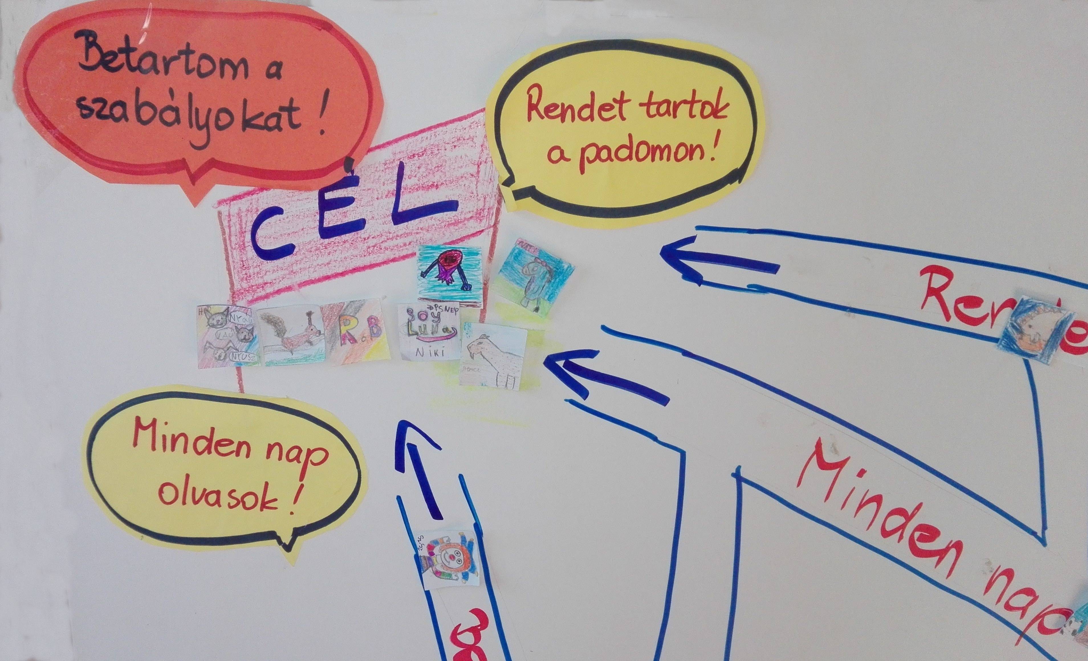 Kis logókat készítettek maguknak, és a napi teljesítést egy-egy előrelépéssel jelezték. A kitűzött két hét végére sokan elérték a cél. Voltak azonban többen, akik még úton voltak. Nekik fenn hagytuk továbbra ia táblát, hogy ők is célba érkezhessenek. A gyerekek saját maguk számára fogalmazták meg azt, miért is volt jó, ha célt tűzünk ki magunk elé: „Volt, hogy játszottam volna, de még nem olvastam, így inkább olvastam egy kicsit. A padomon nagyobb volt a rend a verseny miatt. stb”