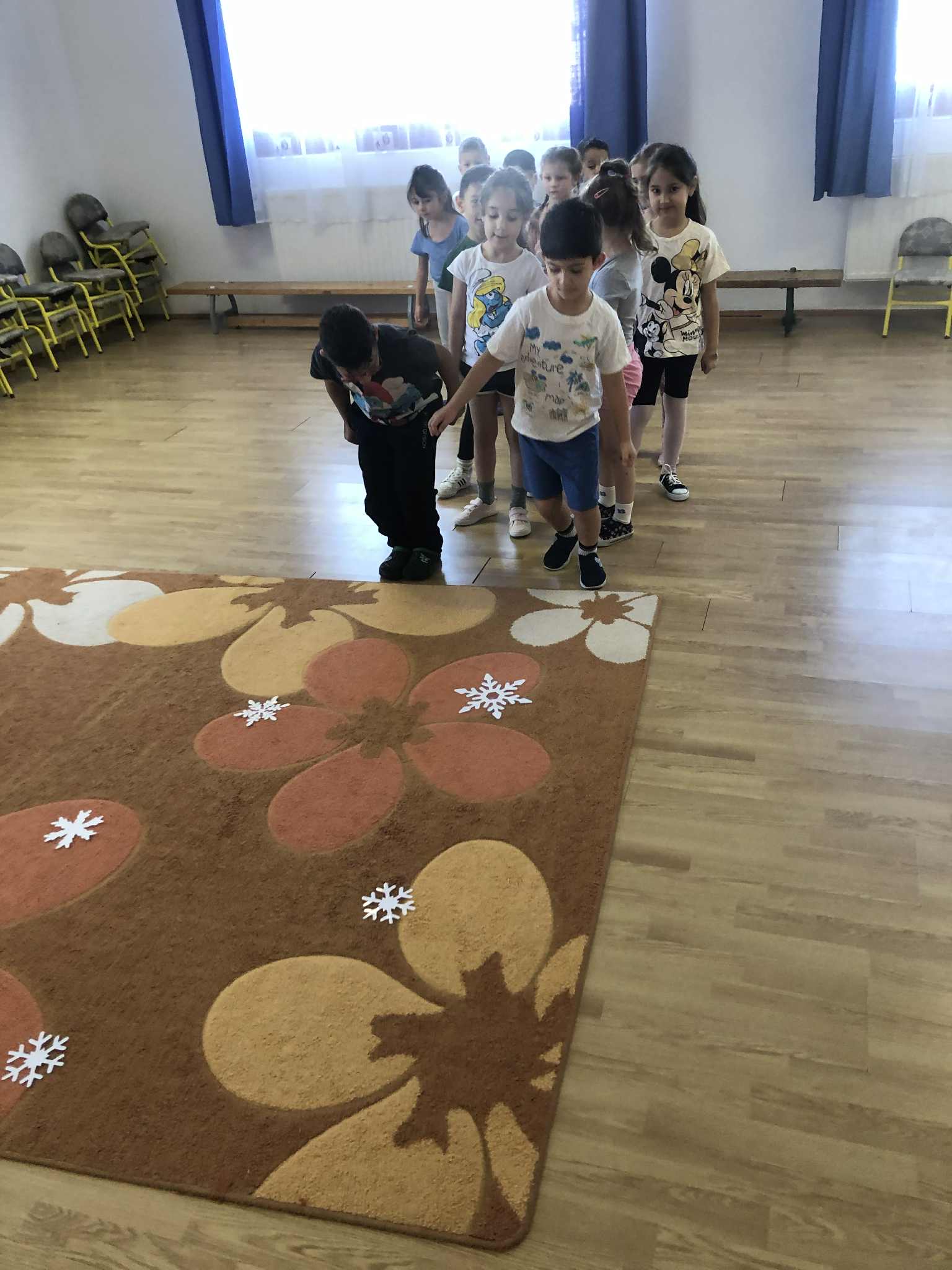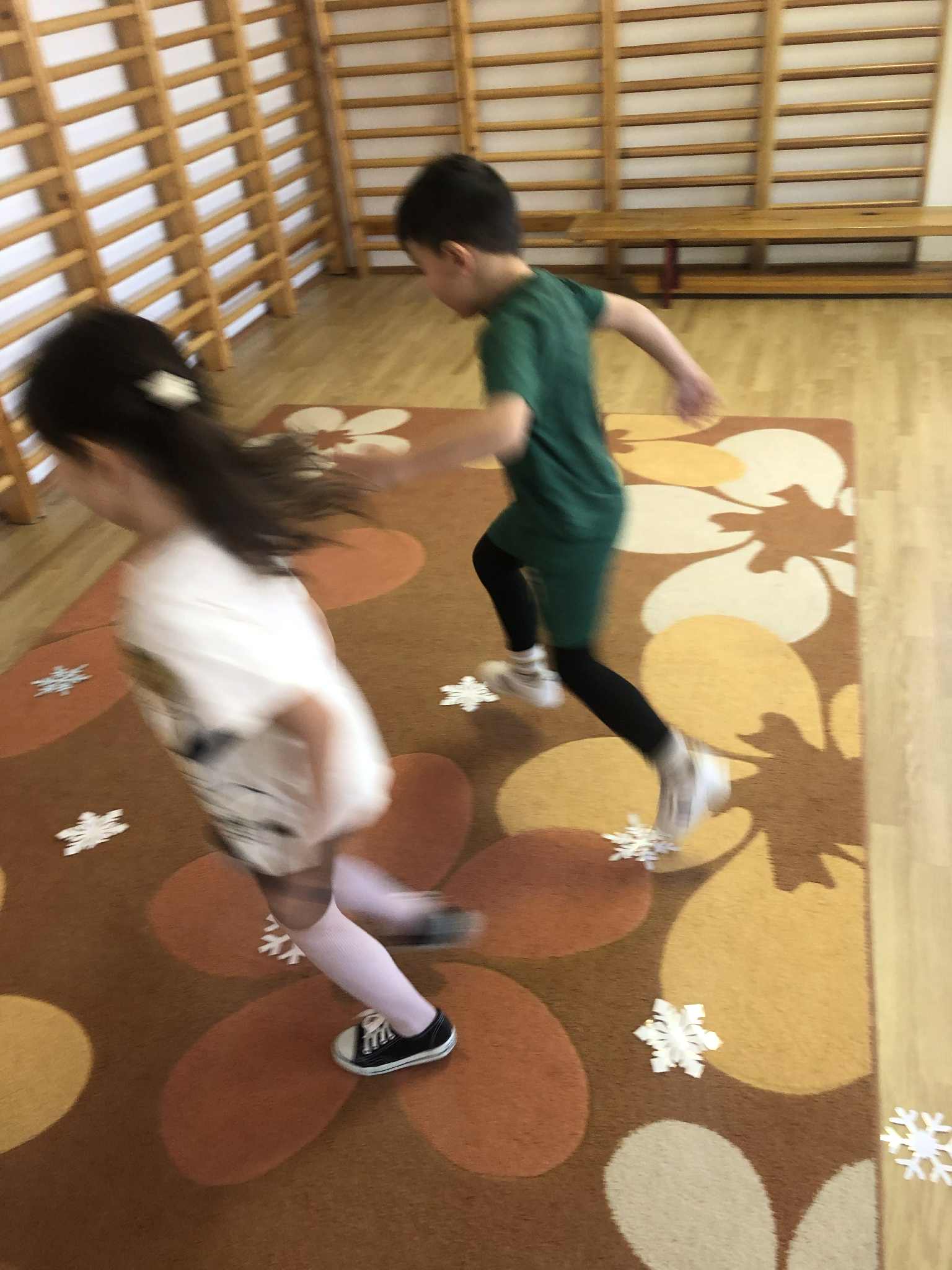 Ki ér hamarabb a célba(bordásfalhoz)?: A gyermekek a földön elhelyezett hópelyhekre lépkedve érhetek el a kijelölt célig.