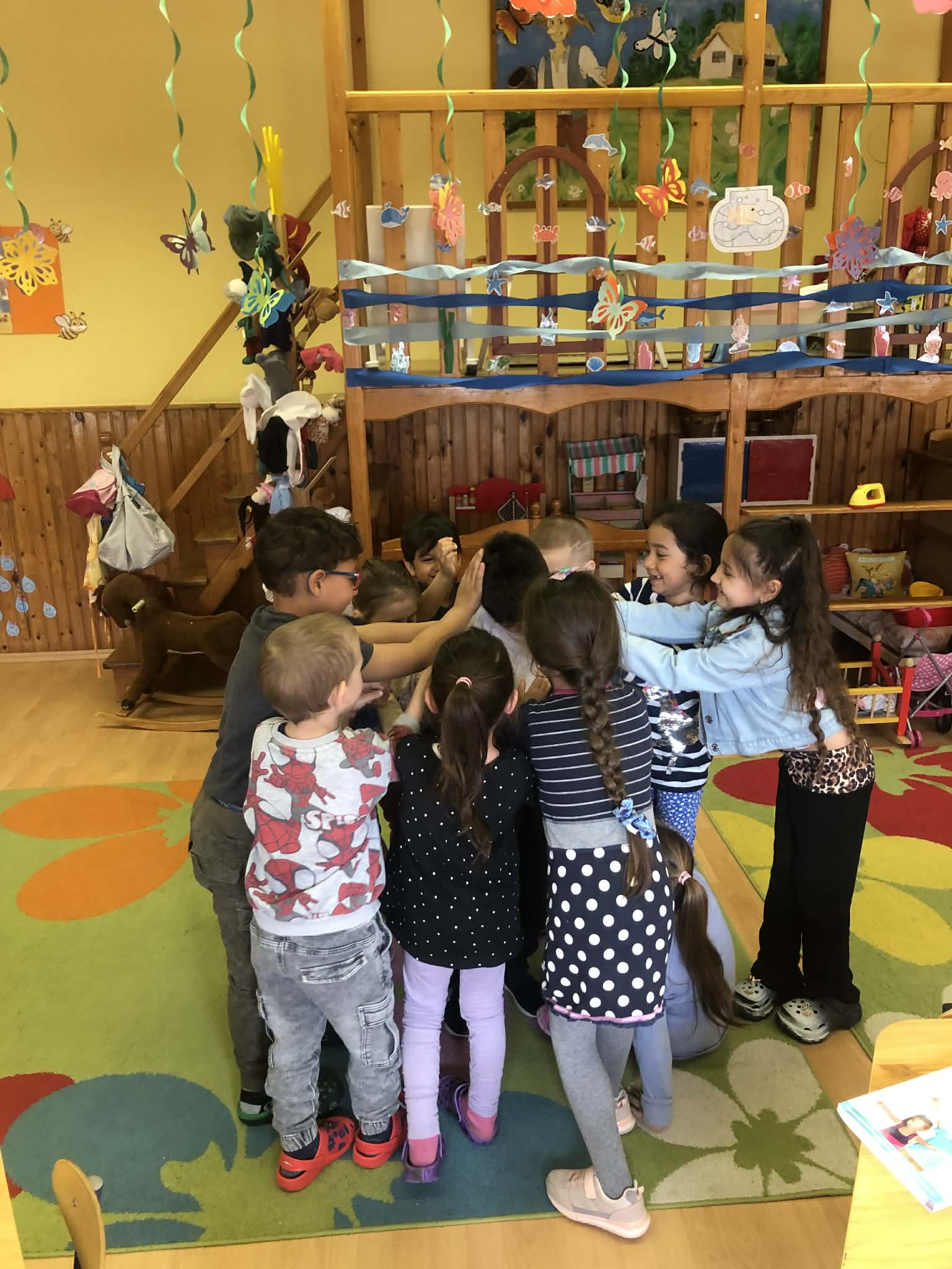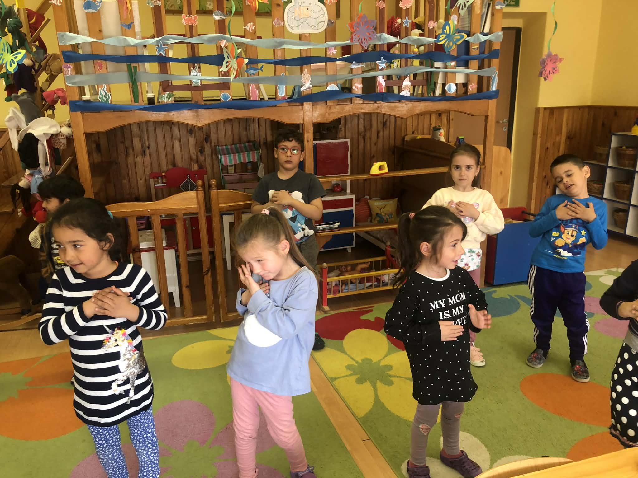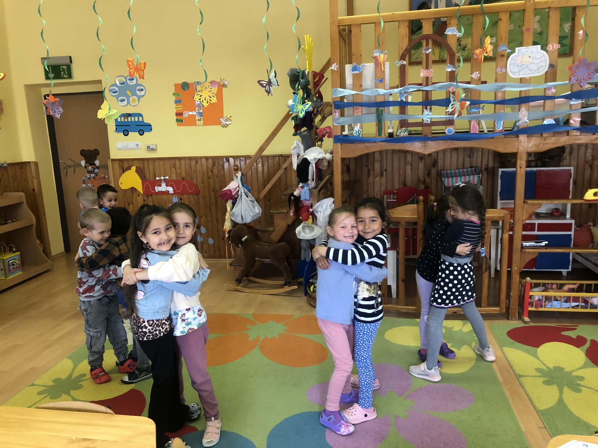 A tevékenységet Bagdi Bella Imádok élni című dal meghallgatásával kezdtük. A dal segít a témára való ráhangolódásra, és a mozgás, mint örömforrás átélésére. Beszélgettünk az apró örömökről, amelyeket az érzékszerveinket keresztül tudjuk leginkább érzékelni. Ezt követően megtanultuk az örömsoroló mondókát és a hozzá kapcsolódó mozgásos gyakorlatot. Majd a feltétel nélküli szeretetre fektettük a hangsúlyt, amit egy mozgásos játékkal dolgoztunk fel. ” Egy ölelés ereje”: A gyermekek szabadon mozognak a teremben. Amilyen számot mondok, annyi gyereknek kell megölelni egymást.