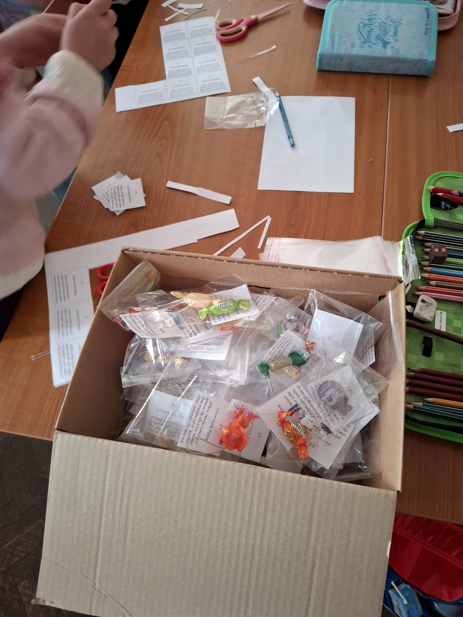 Nagy gonddal és szeretettel készítettük össze az apró meglepetéseket. Kinder figurákat és édes cukorkákat csomagoltunk díszes papírba, de a csomagok legértékesebb része az üzenet volt, amit rájuk írtunk: „Én nem egy elveszett tárgy vagyok, azért találtál meg, mert egy kis örömöt szeretnék okozni neked. Boldog karácsonyt!”