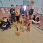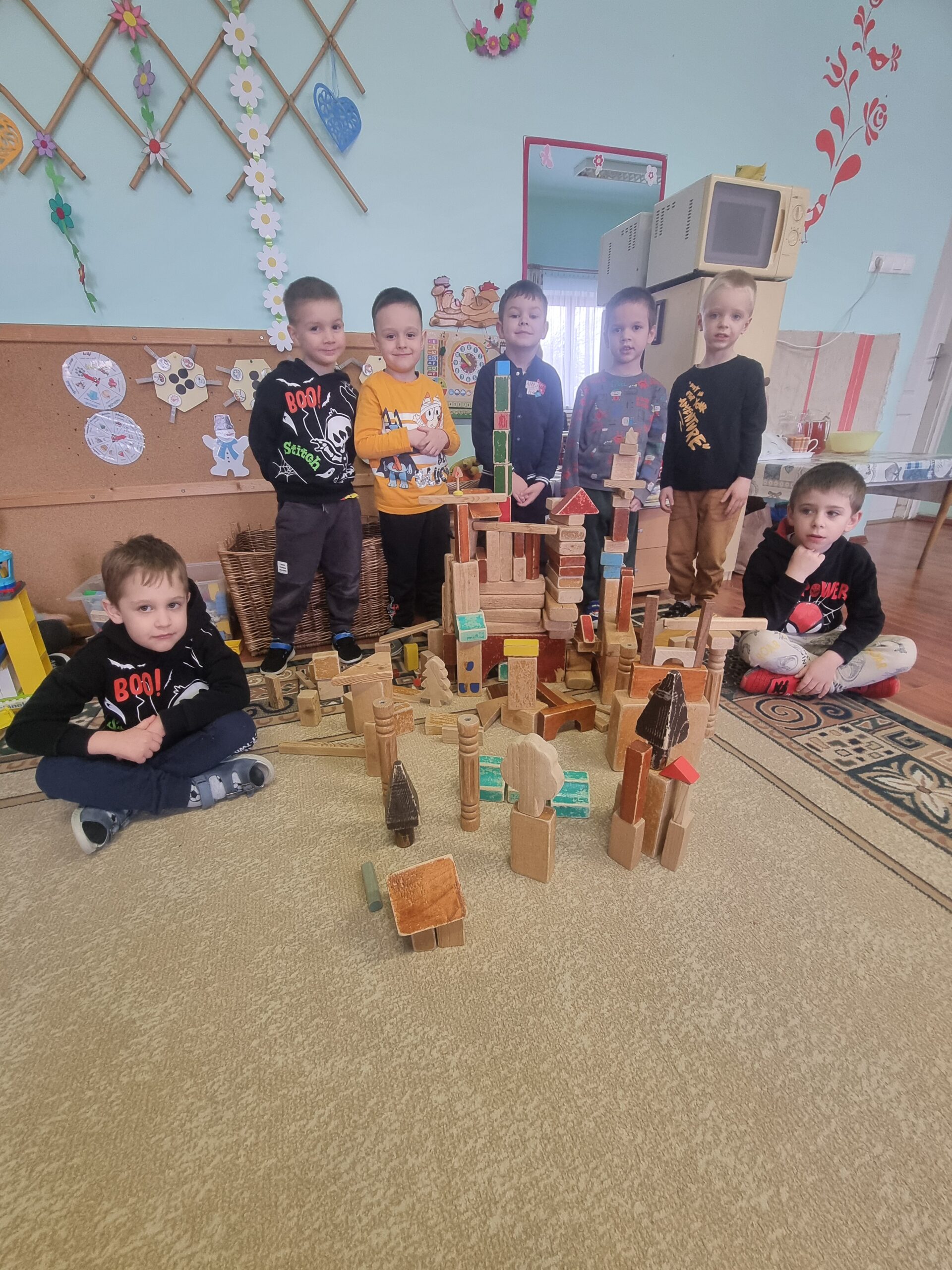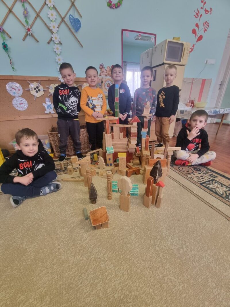 A csoportban lévő fiúk egy része közösen fa építőkockából tornyot épített. Előzményként elmeséltem nekik az Égig érő paszuly c. mesét. Közösen egymást segítve építették meg a tornyot és a körülötte lévő várat is kiegészítésként. A képzeletük szárnyalt közben.
