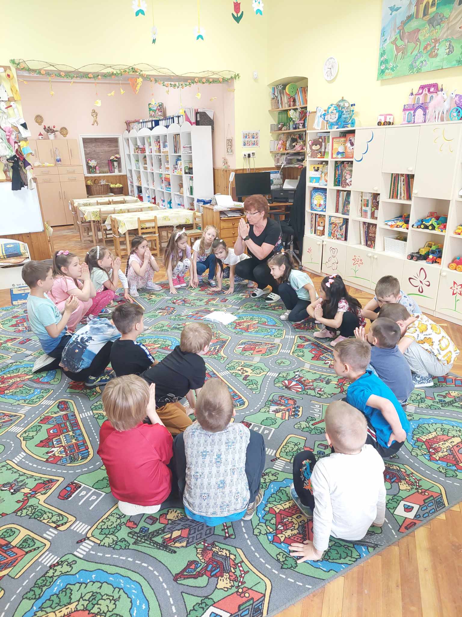Ráhangolódás a foglalkozásra: A gyermekekkel „A napüdvözletet” mozogtuk le a jógából. A gyerekek nagy örömmel végezték a feladatot, szívesen ismételték meg többször is, nagyon szeretnek jógázni!