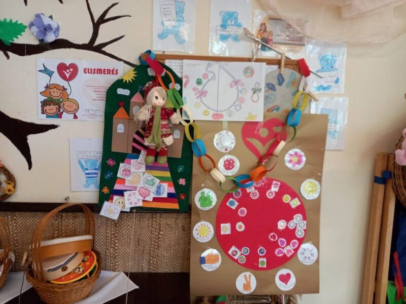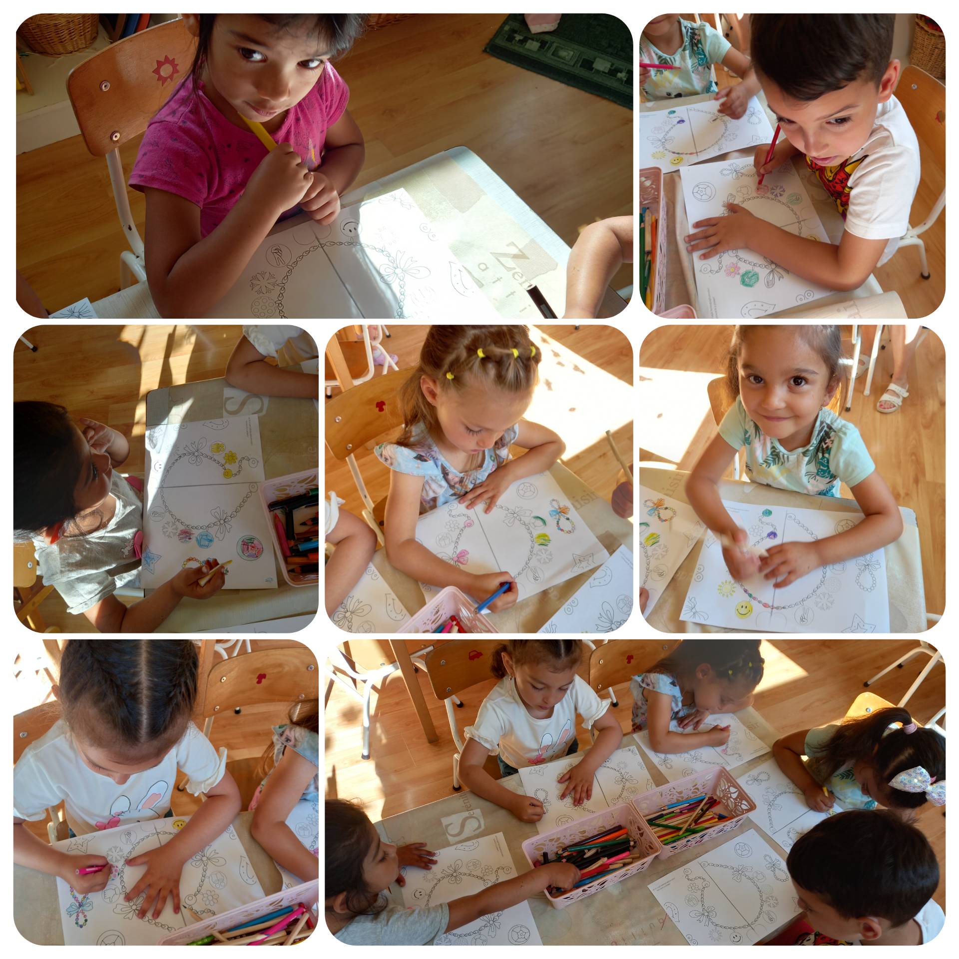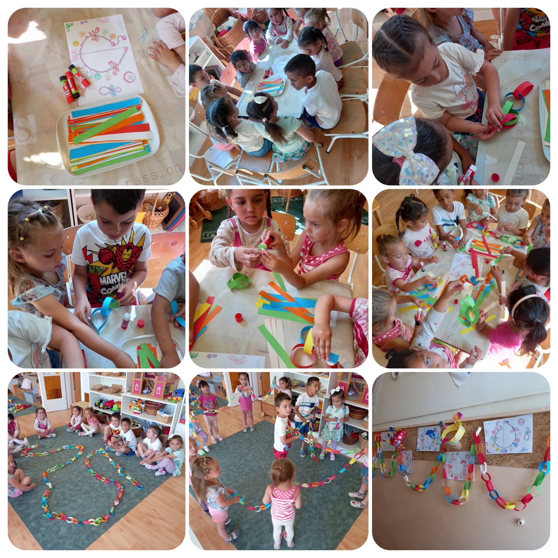 A 2. napon reggel.kiszínezték a boldogságláncos színezőt. Majd elkészítették a gyerekek a saját boldogságláncukat(színespapír csíkokból ragasztották), amelyet utána a szőnyegre húztunk és egymást összefűzve egységet képeztünk.