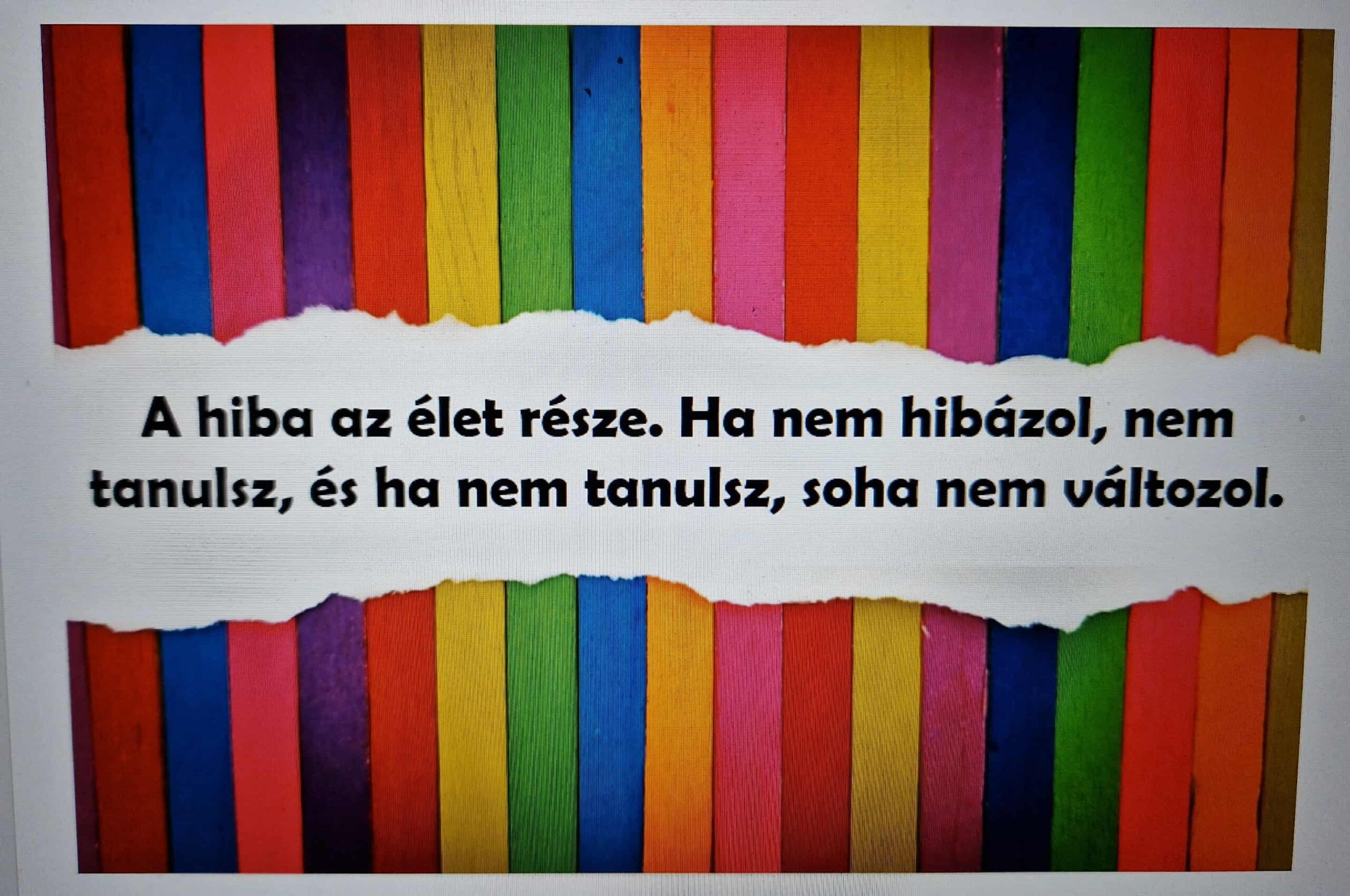 Az órát a javaslatban megadott mondatok összeállításával kezdtük. Csoportonként fejtették meg a mondásokat olvasták fel egymásnak egy rövid kommentet adtak hozzá, a diákok, hogy nekik mit nomd ez a mondat. Majd tisztáztuk az optimista és pesszimista kifejezések jelentését. Egy kisfilmet néztünk meg ehhez a témához kacsolódóan (Pipen – Pixar). Mindenki elmondhatta, hogy számára mit jelentett a film, mit mondott neki újat, mit tanult belőle. Majd körbe álltak a gyerekek és labdát dobáltak egymásnak, és akinél a labda volt, az elmondta, hogy ma mi jó történt vele. Majd egy szerencsekereék segítségével a segédanyagban megadott kérdéskártyákra válaszoltak a gyerekek. Felolvastam a diákoknak néhány szituációt, amelyekre optimistán kellett reagálniuk. Csoportmunkában azt a feladatot kapták, hogy csak papír és ragasztó segítségével egy megadott időintervallumon belül építsenek minél magasabb tornyot. Ne adják fel, akármi is történik kezdjék újra. Ez volt az üzenete a feladatnak. A végén pedig egy kis verset olvastam fel nekik útravalóul. A hibával kapcsolatos mondatok pedig felkerültek az osztályterembe, hogy tudatosuljanak mindenkiben.