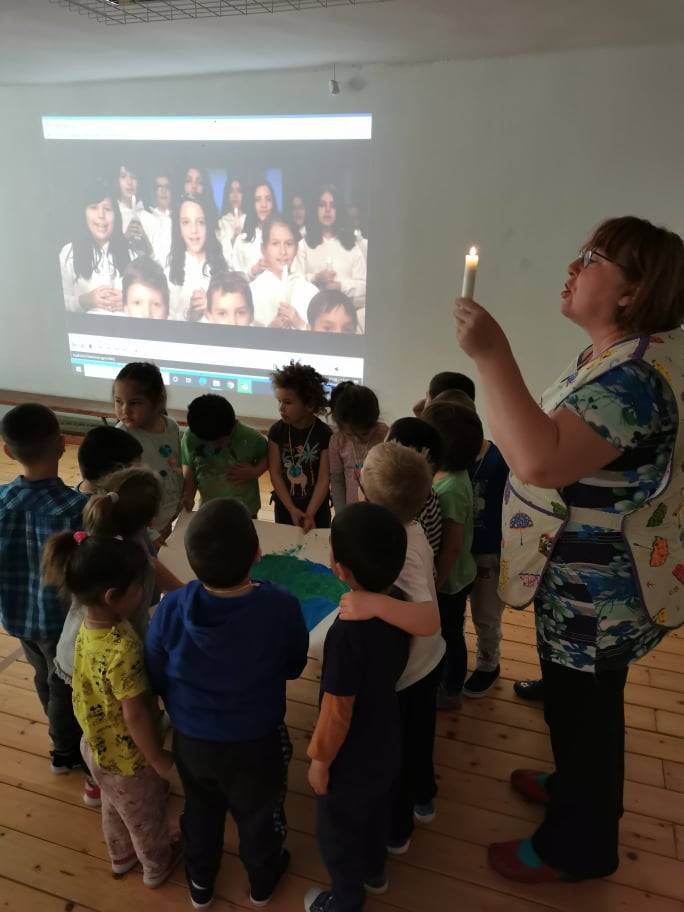 Óvodánk a hatályos rendelkezésekhez igazodva április 19- től újra fogadja a gyermekeket, így a havi programot sikeresen beterveztem a heti tematikába. A Föld napján egy közös óvodai projektnapot szerveztünk, melybe beillesztettük Bagdi Bella: Gyújts egy gyertyát a Földért dalát is. Közösen festettünk egy nagy Földet csomagoló papírra, körbefogtuk, és így hallgattuk, és néztük meg a klipet. A gyerekek is meghatódtak, hatása alá kerültek a képeknek, dalnak. Nagyon meghitt pillanatok voltak.