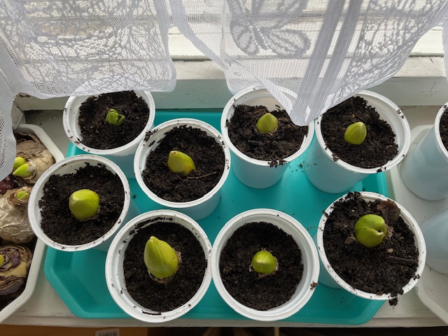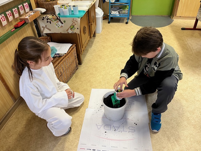 Lehetőségünk volt saját komposztba, újrahasznosított tejesdobozba virághagymát ültetni. Fontos számunkra a zöld környezet, a környezettudatosság. Lelkesen elevenítettük fel az eddig tanult ismeretekek. A foglalkozás végén mindenkinek saját kis növénykéje lett, akiért felelős. Megbeszéltük a gondozás fontosságát. A virágokat természetesen a megfigyelések után haza is viheti.
