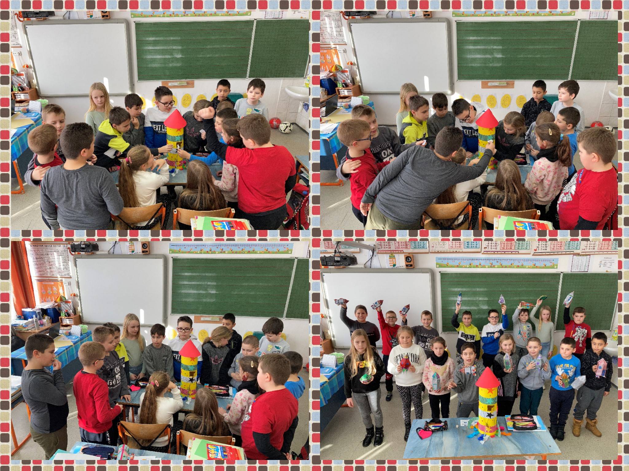 A januári hónap boldogságóráin a célok kitűzéséről és eléréséről beszélgettünk a gyerekekkel. Minden órát játékkal kezdtük (Rend a lelke!, Befogadó fogó, Fagyott babzsák, Igen! Nem! De! Csak azért is!). Megnéztük a Dugattyú c. animációs kisfilmet, majd beszélgettünk arról, hogy milyen célok motiválhatták a szereplőket, ütköztették érveiket is. A Mi leszek, ha nagy leszek? c. feladatnál lerajzolták, hogy a képzeletbeli szuperejüket mire használnák fel. Tetszőleges technikával mindenki elkészítette saját űrhajóját, majd közösen is egyet, és beledobták a kis papírra leírt teljesíthető céljaikat. Végül meghallgatták Veronika Összevisszaországban c. meséjének részletét is. Csoportmunkában eljátszottuk a Füllentős. c. játékot. Beszélgettünk a rendetlenség hátrányáról és a rend előnyéről is. Az órákat mindig a hónap dalának meghallgatásával, koreográfiával zártuk.
