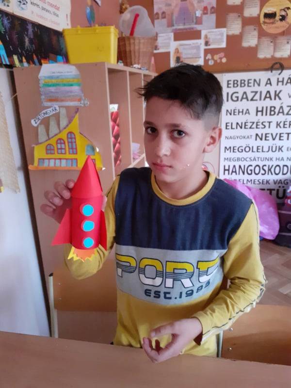 A Dugattyú c. film nagyon tetszett a gyerekeknek. Vitasarokban beszéltünk róla, hogy mit tanulhattunk meg a filmből. A gyerekek azonnal rájöttek, hogy a főszereplő buta célt választott ugyan, de kitartó volt, ha elesett felállt és újra próbálkozott, tehát nem adta fel a kudarcok ellenére sem. Pontosan megfogalmazták véleményükben, hogy mindenkinek tisztában kell lenni a saját erősségeivel és gyengeségeivel ahhoz, hogy jó célt tudjon kitűzni maga elé. Technika órán mindenki elkészítette saját űrhajóját, amivel megcélozza a csillagokat. Belerejtettük a gyerekek egyéni céljait, amit júniusig tűztek ki maguk elé, majd mielőtt elbúcsúzunk, közösen megnézzük, hogy sikerült-e megvalósítani. Az óra végén megmasszíroztuk egymást zenére, majd a Győzni jöttünk dal hallgatása közben mindenki felhelyezte űrhajóját a falra.